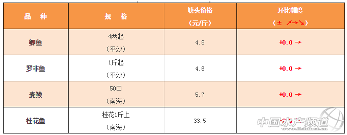 中國水產頻道原創報道,2018年4月6日珠三角地區鯽魚、羅非魚、麥鯪、桂花魚塘頭價行情如下: