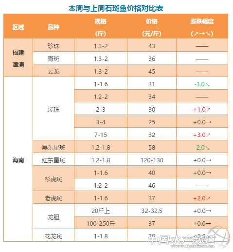 中國水產頻道獨家報道, 文/海南晨海水產有限公司 萊州明波水產有限公司 三通生物工程(濰坊)有限公司 水產前沿吳佳輝 養殖要豐產,更要豐收 石斑、斑石鯛 塘頭最新報價周四見! 石斑魚 福建:2017年孵化、8月份中苗下高位池的云龍斑,目前80%已達到1.3-2斤并開始出售。總體表現上,云龍斑過冬能力和生長速度優于珍珠龍膽。 海南:這段時間的市場需求量比較低,小規格珍珠價格下跌。不過,對比上周的石斑魚價格,可以發現,大規格的珍珠價格有所上漲,老虎斑的價格也上漲了2元/斤。 石斑魚苗 海南:本期珍珠白身苗出苗量較大,但由于區域和規格的差異,價格也在1.4-1.6元不等。東星斑小苗相對緊張,由于前段時間投蟲量不足造成瘦身苗較多,導致標粗成活率低。 相關鏈接 海南石斑魚價跌,但很快會反彈;福建地區價格較為平穩,漲跌互現 珍珠、杉虎斑、東星斑最高漲2元!養戶投苗熱情高珍珠苗賣斷貨 珍珠龍膽魚卵價格波動大,清明前后將進入投苗高峰期 最高53元/斤,石斑魚價持續高企!清明將至,投苗迎來高潮 魚價同比理想,近期價格將持續波動4月5日石斑魚價格播報 公告 近期進入石斑魚投苗期,小編想整理市場上的優質苗企,歡迎大家舉薦。投票選出的企業,小編將進行采訪,并發布購種指南,優先推薦當選企業。 中國水產頻道會持續收集和發布海鱸、石斑商品魚行情信息,發布的行情信息會經過嚴格審核,最新行情爆料請與筆者聯系(添加微信號:13922350546(wxid_f4cer4azkid422)或者發送郵箱wjh fishfirst.cn)。 【關鍵字】:石斑魚 價格 水產養殖 |
