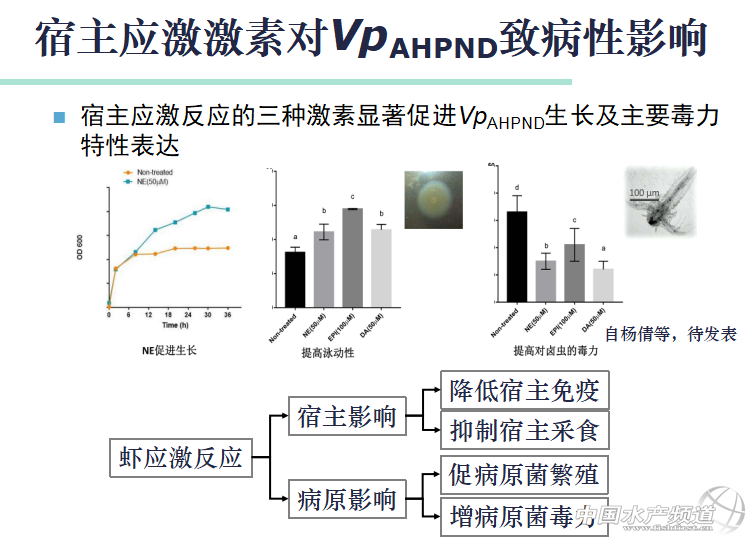 中國水產頻道獨家報道,4月28日,由水產前沿雜志、中國水產頻道主辦,廣東海茂投資有限公司協辦,廣東海威水產養殖有限公司、廣東綠百多生物開發有限公司、廣州市普精生物科技有限公司支持,臺州金湖龍機械設備有限公司、湛江騰飛實業有限公司贊助的“2018中國養蝦高手峰會——臺山站”在臺山碧桂園鳳凰酒店舉辦,中國水產科學院黃海水產研究所黃倢研究員、廣東海洋大學杜國平老師、廣東海洋大學孫成波教授、臺山杰出養蝦達人羅本茂、廣東海茂投資有限公司營銷中心南方營銷部蘇偉盛總經理、廣東海威水產養殖有限公司陳剛總經理、廣東綠百多生物開發有限公司事業部苗廣輝總經理、廣州市普精生物科技有限公司朱盛山技術總監、臺州金湖龍機械設備有限公司潘丹紅銷售經理、湛江騰飛實業有限公司珠三角負責人施國華、以及企業高層、華南多個區域的養殖戶共近300位參與本次會議。 黃倢《2017年南美白對蝦病害回顧與風險防控策略》 2017年,廣東省對蝦病害檢出率最高的是腸胞蟲、虹彩病、急肝;海南省檢出率最高的是急肝病、虹彩病。然而,以病毒病來說,白斑病毒是對國內對蝦影響最大的病毒病。 然而,白斑病并不容易看到,白斑病和紅體是一起存在的,白斑病不單單是看體表是否有白斑,還要檢查其他癥狀,而最重要的是觀察甲殼和皮肉是否粘合,眼球是否反光。 近段時間,大家較為關注的蝦血細胞虹彩病毒病,黃倢老師在會議上也做了介紹。 大家一直猜測的“黑腳病”與虹彩病毒的相關性,黃倢老師表示,“黑腳”不是SHIV特征性癥狀,而可能是死后皮膚氧化所致。針對病毒病的預防,可以采取以下措施: 1、加強病毒早期檢測 2、完善的清池消毒措施 3、殺滅或驅除小型甲殼類 4、穩定、改善水質,不大排大灌式換水 5、保持良好的溶氧 6、降氨氮、亞硝氮 7、采用微生物增強的生物絮團技術 8、飼料中添加抗病微生物 9、定期、適量地投喂免疫增強劑 10、魚蝦混養 2017年廣東省影響較大的急性肝胰腺壞死病菌株包括副溶血弧菌、坎貝氏弧菌、歐文氏弧菌。可能出現以下癥狀: 1、肝臟白膜減少–白膜消失–顏色變淺–黃白–灰白–透明 2、攝食停止、空腸空胃 3、尾扇附肢發藍–蝦體發藍–蝦肉渾濁–蝦體發白 4、快速死亡、跳跳死 5、幼蝦死亡率>80% 6、成蝦死亡率低 急性肝胰腺壞死病可以有針對性預防措施: 1、加強AHPND早期檢測 2、設蓄水池,做好蓄水池水質管理 3、嚴格清池消毒 4、控制放苗數量 5、少吃多餐模式投喂,控制投喂總量,嚴格避免殘餌 6、保持水質、底質良好,控制其中的副溶血弧菌數量 7、有規律換水或及時排出糞便、多施用有益微生物、施用蔗糖或采取生物絮團的養殖模式 8、降低鹽度(<6‰)和pH 9、飼料中拌喂抗病有益菌 10、與羅非魚、梭魚混養 除了上述病害的講述,會上,黃倢老師也介紹了蝦肝腸胞蟲感染預防措施。 【關鍵字】:對蝦 養殖高手 水產養殖 |