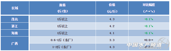 文/ 粵海飼料集團(tuán)、 中國水產(chǎn)頻道 彭曉君 中國水產(chǎn)頻道原創(chuàng)報道,粵西區(qū)域:初步估計今年的羅非價格在4.1-4.6元/斤間波動,現(xiàn)在價格平穩(wěn),短期不會出現(xiàn)大的波動,主要原因現(xiàn)很多養(yǎng)殖戶養(yǎng)魚因盈利低態(tài)度不積極,但出口訂單少,加上如下個月大量達(dá)規(guī)格出魚,價格不升反而會有下降的勢頭。(因貿(mào)易戰(zhàn)從側(cè)面了解現(xiàn)時羅非魚的出口訂單還是比較少!) 廣西區(qū)域:過冬魚少,凍廠開工不足,供需穩(wěn)定。目前羅非走市場1.3斤起報價4.8元/斤(跌0.5元/斤)。 ※上述報價可能會因區(qū)域、規(guī)格、品質(zhì)和時間等因素的不同而會產(chǎn)生差異,在此僅供參考。環(huán)比幅度以本周價格與上周價格數(shù)據(jù)做對比。 【關(guān)鍵字】:羅非魚 羅非魚價格 水產(chǎn)養(yǎng)殖 |