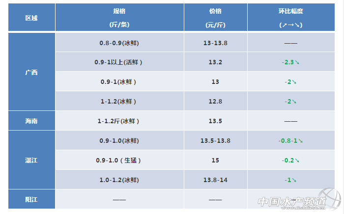 文/ 粵海飼料集團、中國水產(chǎn)頻道 彭曉君 中國水產(chǎn)頻道原創(chuàng)報道,廣西區(qū)域:北海新投苗2000萬尾,累計投苗量相比去年下降幅度較大,轉(zhuǎn)養(yǎng)藍子魚、白魚、海鱺等雜魚較多;欽州防城地區(qū)新投苗3500萬尾,基本投苗完畢,養(yǎng)殖情況正常。今年魚苗生長速度普遍較慢。今年過冬魚長速較慢,隨著5月底過冬魚集中達到上市規(guī)格,雖然正值禁海期,但市場消化疲軟,各規(guī)格冰鮮及活鮮均出現(xiàn)明顯下滑。凍品價格持續(xù)低迷。具體報價:400/500克的9.5-10元/斤(平);500/600克的10-10.75元/斤(平);600/700克的10.75-11.25元/斤(平);700/800克的11.25-11.5元/斤(平)。 湛江區(qū)域:湛江區(qū)域投苗5000萬尾。 海南區(qū)域:整個海南放苗大約9500萬尾,目前養(yǎng)殖情況良好,篩苗成活率平均有7成。 陽江區(qū)域:投苗2000萬尾。 ※上述報價可能會因區(qū)域、規(guī)格、品質(zhì)和時間等因素的不同而會產(chǎn)生差異,在此僅供參考。環(huán)比幅度以本周價格與上周價格數(shù)據(jù)做對比。 【關(guān)鍵字】:金鯧魚 金鯧魚價格 水產(chǎn)養(yǎng)殖網(wǎng) |