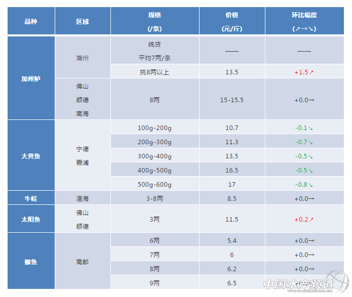 文/ 粵海飼料集團(tuán)、中國(guó)水產(chǎn)頻道 彭曉君 中國(guó)水產(chǎn)頻道原創(chuàng)報(bào)道,加州鱸:湖州近期標(biāo)魚價(jià)格普遍上漲,本周價(jià)格波動(dòng)較大,5月28-29日開價(jià)甚至高至14元/斤。這兩天稍作回調(diào),養(yǎng)殖戶普遍惜售,特別是規(guī)格標(biāo)魚預(yù)計(jì)短期仍會(huì)小幅上漲。佛山順德、南海加州9朝7-8毛/尾,近期加州出魚有硬骨現(xiàn)象,損耗較大;加州舊魚開始陸續(xù)干塘,尾批苗熟身等;病害斜管蟲,指環(huán)蟲,出血,熟身,爛嘴爛嘴,腸炎,鏈球菌感染;大魚諾卡氏,花身,爛身等,持續(xù)高溫天氣部分出現(xiàn)返底現(xiàn)象導(dǎo)致死魚,開始爆發(fā)虹彩病毒。 大黃魚:寧德、霞浦區(qū)域魚排存魚量大,各種規(guī)格大黃魚存魚量較多,市場(chǎng)銷售慢,小規(guī)格魚存量大,價(jià)格持續(xù)低迷。本周魚價(jià)稍有下跌,同比上周下跌0.5-0.8元/斤。 牛蛙:澄海牛蛙已全部抓完,新蛙未達(dá)上市規(guī)格。 鯽魚:高郵地區(qū)本周價(jià)格與上周持平,鹽城鯽魚大面積鰓出血,魚大量出售,沖擊高郵魚價(jià)。 ※上述報(bào)價(jià)可能會(huì)因區(qū)域、規(guī)格、品質(zhì)和時(shí)間等因素的不同而會(huì)產(chǎn)生差異,在此僅供參考。環(huán)比幅度以本周價(jià)格與上周價(jià)格數(shù)據(jù)做對(duì)比。 【關(guān)鍵字】:加州鱸 大黃魚價(jià)格 水產(chǎn)養(yǎng)殖網(wǎng) |