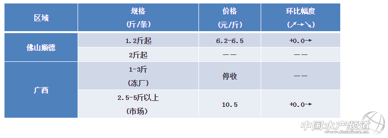 中國水產頻道原創獨家報道,廣西區域:前段時間受網箱拆除、魚積壓跌價的影響,叉尾經過數輪的大拋售后魚存量急極下降,目前大規格叉尾存量少,市場(烤魚等)需求旺盛,魚價已經持續高位企穩,本周大規格叉尾與上周持平。