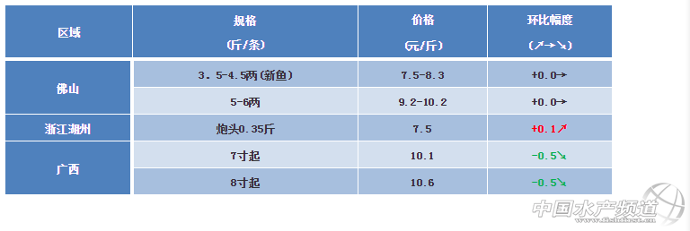 浙江湖州:黃顙魚炮頭0.35斤/條,價格7.5元/斤,黃顙魚由于存塘量偏大,價格一直處于低位,連續兩周上漲了0.5元/斤。