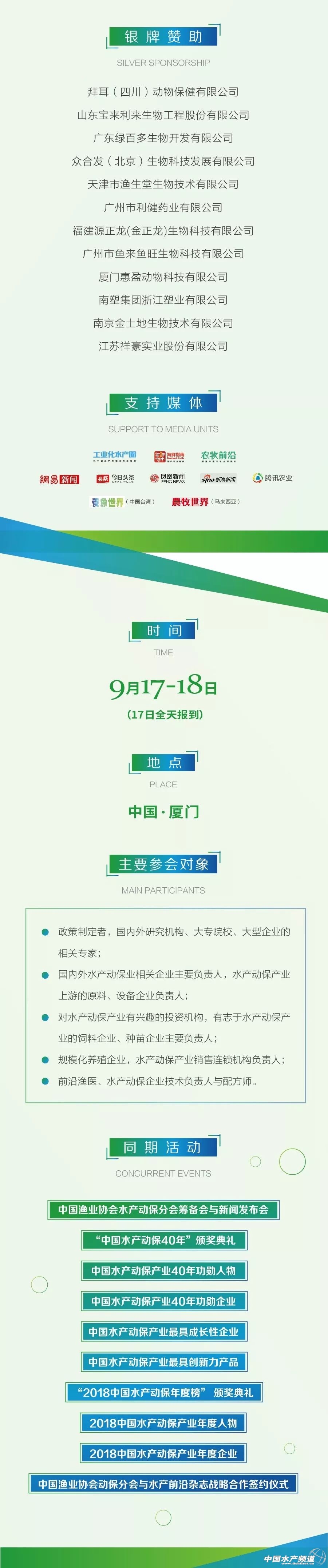 中國水產(chǎn)頻道報(bào)道, 2018中國水產(chǎn)動保產(chǎn)業(yè)年會 2018 China Aquatic Animals Health Care Industry Annual Meeting 暨“中國水產(chǎn)動保40年”頒獎典禮 China Aquatic Animals Health Care Industry 40th Anniversary Celebratio 主題:創(chuàng)新·合作·合規(guī)與未來十年 Themes: Innovation Cooperation Compliance and The Next Decade 9月17-18日 (17日全天報(bào)到) 福建·廈門 贊助聯(lián)系 業(yè)內(nèi)知名企業(yè)如有意贊助,敬請聯(lián)系: 揭小麗:13719331127 張玉梅:18675898952 劉 欣:13728001916 參會報(bào)名 1、注冊費(fèi): 現(xiàn)場注冊繳費(fèi):2000元/人; 8月10日前注冊繳費(fèi),8折優(yōu)惠,1600元/人; 9月15日前注冊繳費(fèi),9折優(yōu)惠,1800元/人。 注冊費(fèi)含資料費(fèi)、餐費(fèi)以及相關(guān)會議活動費(fèi)用,交通住宿自理(注:報(bào)名成功后因個(gè)人原因不能參加的,費(fèi)用恕不退還;住宿及往返車費(fèi)自理)。 2、報(bào)名注冊: 1)掃描以下二維碼注冊 2)短信報(bào)名注冊 編輯短信“動保+姓名+電話+單位”發(fā)送到手機(jī)13809826267,聯(lián)系人:彭曉君 花絮 中國漁業(yè)協(xié)會水產(chǎn)養(yǎng)殖投入品分會 江蘇省水生動物疫病預(yù)防控制中心 江蘇農(nóng)牧科技職業(yè)學(xué)院 江蘇好潤生物科技有限公司 江蘇祥豪實(shí)業(yè)股份有限公司 無錫三智生物科技有限公司 宜興市蘇亞達(dá)生物技術(shù)有限公司 愛睦樂環(huán)保生物技術(shù)(南京)有限公司 上海泓寶綠色水產(chǎn)科技發(fā)展有限公司 北京中泓鑫海生物技術(shù)有限公司 南京金土地生物技術(shù)有限公司 浙江金大地生物工程股份有限公司 江蘇省倉東農(nóng)業(yè)發(fā)展有限公司 博尚生技實(shí)業(yè)(湛江)有限公司 廣東綠百多生物開發(fā)有限公司 |