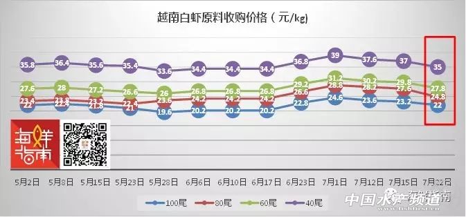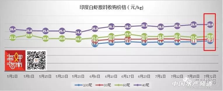文/圖 海鮮指南(seafood-guide) 張麗麗、陳磊 海外白蝦原料收購價格 本周(2018年7月19日- 7月26日)全球白蝦主產區價格波動趨緩,印尼漲價幅度繼續領跑,馬來西亞、印度小幅上升,厄瓜多爾、泰國漲跌互現,越南繼續下跌。具體如下: 注:以上產品為當地蝦類的塘頭收購價,匯率當地貨幣實時兌換人民幣計算 越南白蝦價格已連續3周下跌,本周下滑明顯。與上周相比,100尾/公斤規格降幅為1.2元/公斤,80尾/公斤白蝦降幅為2.8元/公斤,60尾/公斤規格降幅為2元/公斤,40尾/公斤白蝦降幅為2元/公斤。 5月2日至7月22日越南白蝦原料收購價格走勢(來源:海鮮指南) 厄瓜多爾白蝦價格漲跌互現,波動劇烈。與上周相比,100尾/公斤規格降幅為2元/公斤,80尾/公斤白蝦降幅為2.5元/公斤,60尾/公斤規格已經連續4周回升,本周漲幅為1.6元/公斤,40尾/公斤白蝦降幅為0.4元/公斤。據業內人士消息,國內上周40/50、50/60規格的品牌白蝦現貨緊張,有些區域甚至沒貨。 5月2日至7月12日厄瓜多爾白蝦原料收購價格走勢(來源:海鮮指南) 泰國白蝦價格因規格而異。與上周相比,55-77尾/公斤的中等規格白蝦價格下跌明顯,降幅約1元/公斤,而80尾/公斤以下的小規格白蝦價格基本與上周持平,漲幅以<0.3元/公斤居多,主要為匯率影響。 注:以上產品為當地蝦類的塘頭收購價,匯率當泰銖:人民幣=0.2032:1計算 印度白蝦各規格均勻小幅上升。與上周相比,各規格漲幅為0.6元/公斤。 馬來西亞白蝦價格穩定,基本與上周持平。與上周相比,各規格蝦價穩定,漲幅微小僅為0.2元/公斤。 印尼白蝦漲幅相對放緩,但本周依然領跑。與上周相比,100尾/公斤白蝦價格漲幅為1元/公斤,80尾/公斤規格漲幅為0.5元/公斤,60尾/公斤規格漲幅為1.5元/公斤,40尾/公斤規格漲幅為0.5元/公斤。 本期新增國產白蝦塘頭價,詳情如下: 南方國產白對蝦塘頭價 臺風暴雨天氣影響,病蝦上市沖擊蝦價 華南主產區白蝦塘頭價 珠海、新會:本周蝦價30頭22-23元/斤,40頭20.5元/斤,50頭18-18.5元/斤,60頭15-15.5元/斤,暫時與上周基本持平。據了解,珠三角水產市場連續兩天爛市,預計有下滑趨勢,惡劣天氣因素影響最大。 中山:本周蝦價30頭(浸籠)23-24元/斤,40頭19-21元/斤,50頭17-19元/斤,中大規格蝦跌幅達3元/斤。近期惡劣天氣影響,時高溫時暴雨,極端天氣導致蝦塘多有應激發病現象,蝦塘發病趕出塘,蝦價不理想。 海南:本周蝦價30頭18.5-19元/斤,40頭16-17元/斤,50頭15.5元/斤,同比上周略漲0.5元/斤,波動不大。預計后期趨勢應該會持平走,大多為海南島內自銷,受臺風影響近一周內蝦供應有點緊張所以價格不會下降。 陽江:本周蝦價40頭16-17元/斤,50頭14-15元/斤,60頭12.5元/斤,同比上周下跌1-2.5元/斤。近期,因臺風暴雨天氣影響,養戶集中提前出蝦,臺風后病蝦增多,蝦價下跌,更有超低價40頭13元/斤左右,后期蝦價走向不明朗。 廣西:本周蝦價35頭21元/斤,40頭19元/斤,50頭16-17元/斤,60頭14元/斤,同比上周漲1-2元/斤。目前北海區域存塘量少,有7成空塘在清理;欽州區域因放苗遲,且因苗不好生長速度慢,導致這個階段存塘量較多,規格以30-45頭為主。預計,后期蝦價有上漲趨勢。 福建:本周蝦價30頭25-26元/斤,40頭23元/斤,50頭18-19元/斤,同比上周下跌1元/斤。本周,各個規格的蝦都集體降價,多數認為市場購買力不強,現在基本上收冰蝦。