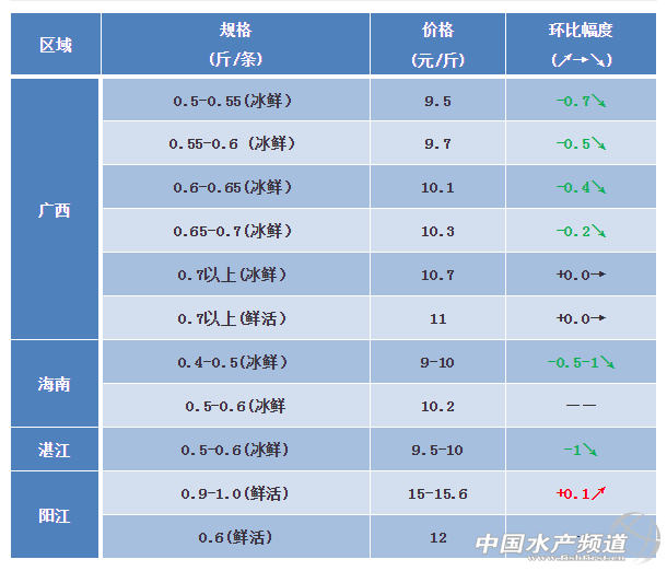 中國水產(chǎn)頻道報道, 金鯧魚 廣西區(qū)域:隨著小規(guī)格0.5-0.7斤的新魚開始逐步上市,冰鮮價格進入下滑通道,活鮮價格與上周持平,但走量較少。凍品價格持續(xù)低迷,具體報價:400/500克的9.5-9.75元/斤(平);500/600克的10-10.5元/斤(平);600/700克的10.5-11.0元/斤(平);700/800克的10.75-11.5元/斤(平)。欽州港的養(yǎng)殖戶最近很多人選擇出魚,價格下跌,0.5-0.6斤(冰鮮)9.5-9.6元/斤,0.6斤以上(冰鮮)9.8-10.1元/斤。 湛江區(qū)域:魚排網(wǎng)箱魚規(guī)格在0.4-0.55斤/尾,用料增加,近期有出現(xiàn)小瓜蟲和腸炎現(xiàn)象。 海南區(qū)域:養(yǎng)殖正常,現(xiàn)在海南凍魚存貨不多,市場需求開始加大。 陽江區(qū)域:金鯧魚感染小瓜蟲和車輪蟲近10天,預(yù)計未來存在一定的病害風險。 【關(guān)鍵字】:金鯧魚 塘頭價 水產(chǎn)養(yǎng)殖 |