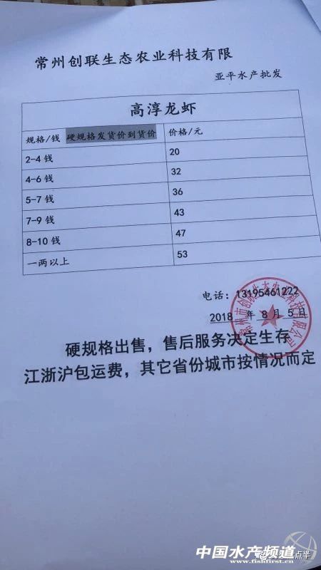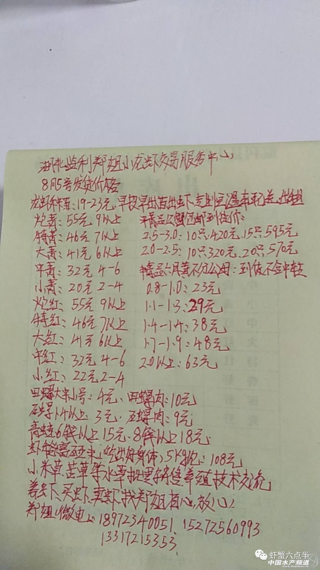 中國水產頻道報道, 報價是為了讓養殖戶能早點了解價格信息,根據行情盡量賣個好價錢。希望養殖戶朋友也能參與報價,提供價格信息,讓更多的人能更快更早的了解當天行情 2018.8.5 龍蝦 六月黃 【關鍵字】:蝦蟹 價格 水產養殖 |
