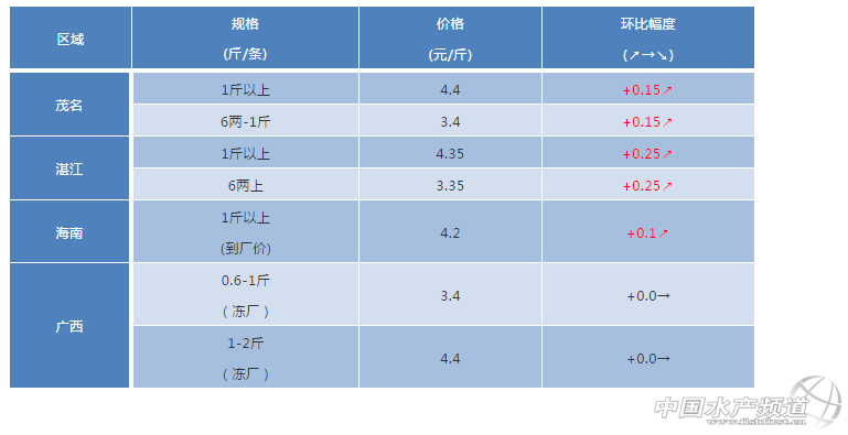 文/ 粵海飼料集團、中國水產頻道 彭曉君 中國水產頻道原創報道,粵西、海南區域:湛江小規格魚略加一點價錢出魚,達規格魚未來穩中略升。茂名、海南區環保網箱拆掉后,淡水魚價格上升,帶動羅非魚小量上升。 廣西區域:目前在養羅非魚新魚在半斤左右,羅非規格魚上市較少,加工廠開工不足,價格與上周基本持平。由于近期氣溫較高,羅非鏈球菌開始發病,魚塘出現主動或被動減料。不過羅非魚存塘量不多,部分養殖戶開始轉養叉尾,預計今年羅非的市場會進一步萎縮。市場價方面:鮮活1.3斤上的5元/斤(平)。 ※上述報價可能會因區域、規格、品質和時間等因素的不同而會產生差異,在此僅供參考。環比幅度以本周價格與上周價格數據做對比。 【關鍵字】:羅非魚 羅非魚價格 水產養殖 |