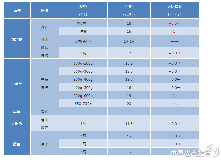 文/ 粵海飼料集團、中國水產(chǎn)頻道 彭曉君 中國水產(chǎn)頻道原創(chuàng)報道,加州鱸:湖州區(qū)域由于老口鱸魚出魚接近尾聲,價格略有上漲,后面魚價短期可能繼續(xù)小幅上漲。佛山順德、南海區(qū)域加州新魚6兩炮頭1.3-1.4斤15元,炮頭1.1-1.2斤13.5-14元。新魚出血,爛身,爛嘴爛鰓,腸炎,諾卡氏;加州舊魚諾卡氏,爛身潰瘍。 大黃魚:寧德、霞浦區(qū)域魚排存魚量大,主要為2-8兩規(guī)格,小規(guī)格魚市場銷售緩慢;8兩以上大規(guī)格規(guī)格魚少,不足2%,大規(guī)格魚價格較好。本周小規(guī)格魚與上周持平;大規(guī)格魚市場緊缺,價格經(jīng)過前段時間大幅上漲后,本周較大幅度回落,同比上周下跌2-4元/斤。 牛蛙:澄海區(qū)域牛蛙已全部抓完,新蛙未達上市規(guī)格。 鯽魚:高郵鯽魚近期沒有出魚,價格變化不大。 ※上述報價可能會因區(qū)域、規(guī)格、品質(zhì)和時間等因素的不同而會產(chǎn)生差異,在此僅供參考。環(huán)比幅度以本周價格與上周價格數(shù)據(jù)做對比。 【關(guān)鍵字】:大黃魚 鯽魚價格 水產(chǎn)養(yǎng)殖 |