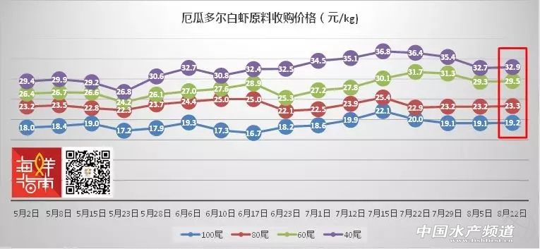 文/圖 海鮮指南(seafood-guide) 張麗麗、陳磊 海外白蝦原料收購價格 本周(2018年8月11日- 8月17日)全球白蝦主產區價格出現新波動,印度漲價,泰國、馬來西亞漲跌互現,厄瓜多爾、越南蝦價平穩,印尼部分規格大跌。具體如下: 注:以上產品為當地蝦類的塘頭收購價,匯率當地貨幣實時兌換人民幣計算 越南白蝦價格已連續3周保持穩定。與上周相比,部分規格無波動,部分規格漲幅在0.2元/公斤,十分平穩。 5月2日至8月12日越南白蝦原料收購價格走勢(來源:海鮮指南) 厄瓜多爾止跌企穩。與上周相比,各規格白蝦價格稍微回升,漲幅在0.1-0.2元/公斤。 5月2日至8月12日厄瓜多爾白蝦原料收購價格走勢(來源:海鮮指南) 泰國白蝦漲跌互現。與上周相比,60-80尾/公斤的中等規格白蝦價格小幅上漲,漲幅在0.2-1元/公斤,90-150尾/公斤的小規格白蝦價格下滑明顯,降幅以1.3-1.9元/公斤居多。 注:以上產品為當地蝦類的塘頭收購價,匯率當泰銖:人民幣=0.2072:1計算。漲跌幅度中,黑色字體為漲幅,紅色字體為降幅。 印度連續2周上漲,且升幅明顯。與上周相比,100尾/公斤白蝦價格漲幅為1.4元/公斤,80尾/公斤規格漲幅為1.6元/公斤,60尾/公斤規格漲幅為2元/公斤,40尾/公斤規格漲幅為2元/公斤。 5月2日至8月5日印度白蝦原料收購價格走勢(來源:海鮮指南) 馬來西亞價格基本穩定,有漲有跌幅度較小。與上周相比,100尾/公斤白蝦價格漲幅為0.8元/公斤,80尾/公斤規格漲幅為0.7元/公斤,60尾、40尾/公斤規格降幅為0.1元/公斤。 印尼40尾/公斤大跌6.8元。與上周相比,100尾/公斤白蝦價格漲幅為0.8元/公斤,80尾/公斤規格漲幅為0.1元/公斤,60尾/公斤規格降幅為1.8元/公斤,40尾/公斤規格價格大跌,降幅高達6.8元/公斤。 本期國產白蝦塘頭價,詳情如下: 國產南方白對蝦 存塘量少,各產區蝦價齊漲 華南主產區白蝦塘頭價 珠海、新會:本周蝦價40頭21-22元/斤,50頭17元/斤,60頭14.5元/斤,70頭13元/斤,80頭12元/斤,蝦價漲幅明顯!中大規格蝦漲幅高達5元/斤,50頭下小規格蝦漲0.5-1元/斤。目前存塘基本為中小規格蝦,本地大規格蝦存塘少,外省存塘量也在減少,長途車缺貨,本地市場好轉。 中山:本周蝦價30頭24-25元/斤,40頭21元/斤,50頭17-18元/斤,60頭16元/斤,同比上周整體蝦價上漲2元/斤。近段時間天氣較穩定,養殖情況好轉(但白便情況依然普遍),加之現市場缺蝦,蝦價有上漲趨勢。 海南:本周蝦價30頭22-22.5元/斤,40頭19元/斤,45頭17元/斤,整體蝦價穩中略漲0.5元/斤。有業者反饋漲價簡單原因:臺風來了肯定漲!目前正處于青黃不接的時候,第二季養蝦的養戶少,冬季蝦剛放苗,達上市規格蝦量少,市場有缺蝦現象,蝦價只會漲不會跌。 陽江:本周蝦價20頭23-24元/斤,30頭19元/斤,40頭17-17.5元/斤,50頭16元/斤,60頭15元/斤,整體蝦價正處于上漲階段。70-90頭規格蝦漲0.5元/斤,50-65頭漲1元/斤,大規格蝦漲1.5元/斤以上。 廣西:本周蝦價40頭22.5元/斤(漂亮蝦價),50頭18元/斤,60頭14.5-15元/斤。目前大規格蝦存塘較少,新放苗為中小規格居多,尚未達到上市規格,本周蝦價以穩定為主,大規格蝦量少,漂亮蝦開價高。 福建:本周蝦價30頭27元/斤,40頭23.5元/斤,50頭20元/斤,60頭18-18.5元/斤,目前各個規格的蝦價都比較穩定,30頭蝦價格漲2元/斤。最近市場蝦價不穩定,或有在跌趨勢。