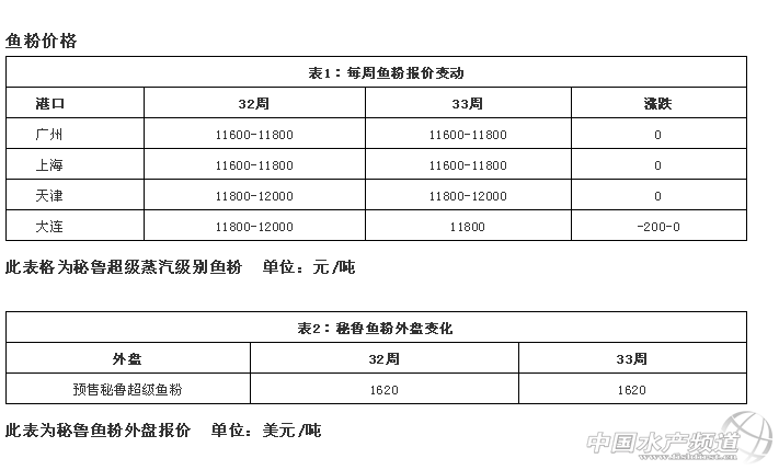 中國水產(chǎn)頻道報(bào)道, 第33周魚粉價(jià)格 第33周魚粉價(jià)格情況如下:廣州、上海、天津地區(qū)魚粉價(jià)格分別為11600-11800元/噸、11600-11800元/噸、11800-12000元/噸,大連魚粉11800元/噸,下降了200元/噸。秘魯魚粉外盤無變化。具體情況如下: 第33周港口魚粉庫存 第33周港口魚粉庫存情況如下:上海港本周庫存4.7萬噸;黃埔港4.6萬噸,下降了0.1萬噸;天津港0.08萬噸,上漲了0.01萬噸;大連港0.6萬噸,上漲了0.1萬噸;其他地區(qū)0.4萬噸,保持不變。 魚粉供需心態(tài)博弈較明顯,市場穩(wěn)價(jià)觀望居多 秘魯本季中北部:捕魚于2018年8月10日零時(shí)正式結(jié)束。據(jù)秘魯海洋研究院的捕魚報(bào)告稱,2018年4月7日-7月30日期間中北部公布于314.5萬噸,完成配額數(shù)量的94.83%,剩余配額數(shù)量為5.17%;從捕魚形式來看大部分為成魚,幼魚秘魯從數(shù)量上看為17%,從重量上看為9%。 南部:2018年秘魯南部下半年捕季自7月1日開始,至12月31日結(jié)束,配額數(shù)量為53.5萬噸,7月1日-8月14日秘魯南部捕魚量為55925噸,剩余配額數(shù)量為479075噸,完成配額比例10.5%。 目前秘魯南部捕魚正是進(jìn)行中,但捕撈進(jìn)程較緩慢,加上天氣擔(dān)憂,秘魯當(dāng)?shù)貜S商存在挺價(jià)意向。同時(shí),我國魚粉市場供需雙方博弈較為明顯,持貨商挺價(jià)心態(tài)較強(qiáng),市場穩(wěn)價(jià)觀望居多;值得欣慰的是,近期魚粉走貨量尚可。 本周已經(jīng)是8月份第三周,接下來的9月,黃渤海開捕,國產(chǎn)魚粉也隨之會(huì)逐漸上量,后期需關(guān)注沿海捕魚情況以及國產(chǎn)魚粉廠開工情況。預(yù)計(jì)短期魚粉市場或依舊穩(wěn)價(jià)觀望,市場供需心態(tài)博弈為主,后期持續(xù)關(guān)注秘魯鳀魚資源考察進(jìn)展、進(jìn)口魚粉市場行情、以及國內(nèi)魚粉終端需求形勢。 |