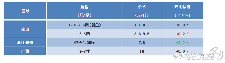文/ 粵海飼料集團(tuán)、中國水產(chǎn)頻道 彭曉君 中國水產(chǎn)頻道原創(chuàng)報道,佛山區(qū)域:本周魚價穩(wěn)定略有上漲0.2元/斤。目前黃顙魚新魚存塘量大,今年放苗少,成數(shù)低。近期天氣變化大病害多,病害:腸炎,爆頭,爛身,爆發(fā)性出血,腹水等 浙江湖州:較上周價格略有下降0.2元/斤,但不會有大的波動。供求關(guān)系相對平衡,養(yǎng)殖戶基本不虧本,市場行情依然較低,預(yù)期后期價格維穩(wěn)。 廣西區(qū)域:近期氣溫炎熱,黃顙魚病害多,耐運輸能力差,量少價穩(wěn)。本周價格與上周持平。 ※上述報價可能會因區(qū)域、規(guī)格、品質(zhì)和時間等因素的不同而會產(chǎn)生差異,在此僅供參考。環(huán)比幅度以本周價格與上周價格數(shù)據(jù)做對比。 【關(guān)鍵字】:黃顙魚 黃顙魚價格 水產(chǎn)養(yǎng)殖 |