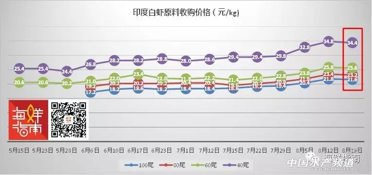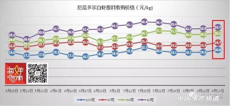 文/圖 海鮮指南(seafood-guide) 張麗麗、陳磊 海外白蝦原料收購價格 本周(2018年8月19日- 8月25日)全球白蝦主產區價格總體看漲,其中,越南、厄瓜多爾白蝦價格上漲,印度蝦價回落,馬來小蝦漲價明顯,印尼價格穩定。具體如下: 注:以上產品為當地蝦類的塘頭收購價,匯率按當地貨幣實時兌換人民幣計算 越南白蝦價格上揚。與上周相比,60、80、100尾/公斤的白蝦價格漲幅為1.6元/公斤,40尾/公斤的漲幅為1.4元/公斤。在經歷了一個月的低谷后,越南白蝦開始反彈。 5月15日至8月19日越南白蝦原料收購價格走勢(來源:海鮮指南) 厄瓜多爾白蝦加速回升。與上周相比,80、100尾/公斤的白蝦價格漲幅為1.4元/公斤,40、60尾/公斤的漲幅為0.8元/公斤。 海鮮指南從頌嘉(南美蝦皇)中國業務代表徐寶淵先生了解到:近期,厄瓜多爾養殖戶因蝦價持續低迷,紛紛提前收蝦。8月份,厄瓜多爾下一季白蝦的投苗率明顯高于上個月,預示著當地原料蝦存塘量正在下跌。同時,國內市場的凍蝦庫存在不斷減少,受供求關系影響,未來原料蝦價格將會上揚。 5月15日至8月19日厄瓜多爾白蝦原料收購價格走勢(來源:海鮮指南) 印度白蝦小幅回落。與上周相比,60、80、100尾/公斤白蝦價格開始回落,降幅為0.2元/公斤,40尾/公斤規格降幅為0.4元/公斤。 5月15日至8月19日印度白蝦原料收購價格走勢(來源:海鮮指南) 馬來西亞小蝦上漲。與上周相比,80、100尾/公斤白蝦漲幅為1元/公斤,40、60尾/公斤漲幅為0.1元/公斤。 印尼白蝦基本穩定。與上周相比,100尾/公斤白蝦價格漲幅為0.3元/公斤,60尾/公斤規格漲幅為0.5元/公斤,40、60尾/公斤規格價格與上周持平。 本期國產白蝦塘頭價,詳情如下: 國產南方白對蝦 珠三角產區蝦價受海捕貨沖擊下跌 華南主產區白蝦塘頭價 珠海、新會:本周蝦價40頭21元/斤,45頭18.5元/斤,50頭16-16.5元/斤,60頭14元/斤,整體蝦價同比上周下跌0.5元/斤左右。大海捕撈開禁,大量海貨沖擊蝦價!今日珠三角市場有爛市現象。冰蝦價格影響不大,71-72頭11.5元/斤打樣。 海南:本周蝦價30頭22.5元/斤,40頭19元/斤,45頭17.5元/斤,50頭16元/斤,大規格蝦存塘量少,價格穩定,中小規格蝦價格逐步上漲0.5元/斤。按照目前的行情走勢預測,蝦價只漲不跌。 陽江:本周蝦價20頭25元/斤,30頭23元/斤,40頭21元/斤,50頭19元/斤,60頭17元/斤,整體蝦價猛速上漲,漲幅高達4元/斤。存塘量少,生猛活水蝦受市場青睞收購價高。 廣西:本周蝦價33頭29元/斤,35頭26.5元/斤,40頭24元/斤。目前大規格蝦存塘較少,市場需求旺盛,蝦價高位運行。據收蝦商報價,明天捉20-21頭33.2元/斤。預計蝦價在中秋節前會穩定有漲,節后開始下調。 福建:本周蝦價30頭27元/斤,40頭24元/斤,50頭19元/斤,60頭17元/斤,中大規格蝦價格保持穩定略有上漲,小蝦因質量不佳價格波動下調。冰蝦價格:50頭14.5元/斤,60頭13.5元/斤,每10頭差1元/斤。