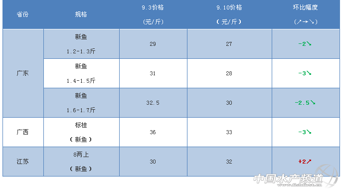 文/圖 何氏水產(chǎn) 水產(chǎn)前沿 李靜 1、廣東桂魚(yú)價(jià)格比上周同期下跌了2-3元/斤,主要原因是:1.9月份學(xué)生開(kāi)學(xué),消費(fèi)量下降,市場(chǎng)行情不好,銷(xiāo)量少;2.本地魚(yú)推出市場(chǎng),價(jià)格便宜,成活率高,占據(jù)一定市場(chǎng)份額;3.餌料魚(yú)貴,天氣不好,魚(yú)長(zhǎng)得慢,大魚(yú)頭數(shù)量不多。現(xiàn)在存塘量的新魚(yú)魚(yú)頭大部分都是1.2-1.3斤,1.7-1.8斤的魚(yú)頭很少,導(dǎo)致市場(chǎng)偏小規(guī)格的魚(yú)多,偏大規(guī)格緊缺。受白露、教師節(jié)、中秋節(jié)影響,桂魚(yú)市場(chǎng)行情好轉(zhuǎn),養(yǎng)戶惜售,預(yù)計(jì)偏大規(guī)格有一定上漲空間。 2、受到廣東新魚(yú)價(jià)格影響,廣西標(biāo)桂下跌了3元/斤。江蘇本地能上市的魚(yú)比較少,8兩以上新魚(yú)上漲了2元/斤。 各地區(qū)桂花魚(yú)出塘價(jià) 相關(guān)推薦 往期鱖魚(yú)價(jià)格行情 http://m.fuqitext.com/portal.php?mod=list&catid=53 【關(guān)鍵字】: 廣東鱖魚(yú) 水產(chǎn)養(yǎng)殖 |