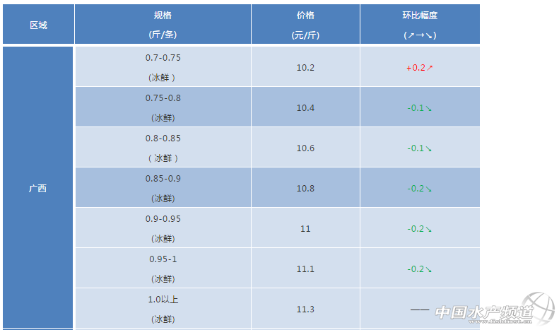 文/ 粵海飼料集團(tuán)、中國(guó)水產(chǎn)頻道 彭曉君 中國(guó)水產(chǎn)頻道原創(chuàng)獨(dú)家報(bào)道,廣西區(qū)域:欽州防城、北海地區(qū)由于受臺(tái)風(fēng)“山竹”影響,臺(tái)風(fēng)前搶收入凍庫(kù),價(jià)格凌亂,無(wú)法統(tǒng)計(jì)。目前早批苗頭魚(yú)已達(dá)1一斤,大部分魚(yú)棑都是6-8兩的魚(yú),客戶(hù)陸續(xù)抓緊出魚(yú),出魚(yú)規(guī)格以7兩以上為主,為降低風(fēng)險(xiǎn),今年較多的客戶(hù)選擇六兩左右就開(kāi)始出魚(yú),這樣可以縮短養(yǎng)殖周期、降低風(fēng)險(xiǎn)。由于近期臺(tái)風(fēng)臨近,客戶(hù)出魚(yú)比較集中,價(jià)格有所下跌。凍品(新魚(yú))200/30010元/斤(平);300/40011元/斤(平);400/50012元/斤(平)。 湛江區(qū)域:臺(tái)風(fēng)“山竹”登錄前搶收,價(jià)格下跌。 陽(yáng)江區(qū)域:本周魚(yú)價(jià)穩(wěn)定,養(yǎng)殖情況:部分魚(yú)有感染小瓜蟲(chóng)病害,魚(yú)吃料大幅減少。 ※上述報(bào)價(jià)可能會(huì)因區(qū)域、規(guī)格、品質(zhì)和時(shí)間等因素的不同而會(huì)產(chǎn)生差異,在此僅供參考。環(huán)比幅度以本周價(jià)格與上周價(jià)格數(shù)據(jù)做對(duì)比。 【關(guān)鍵字】:金鯧魚(yú) 金鯧魚(yú)價(jià)格 水產(chǎn)養(yǎng)殖 |