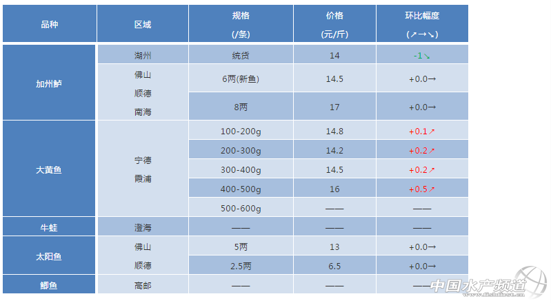 文/ 粵海飼料集團、中國水產頻道 彭曉君 中國水產頻道原創獨家報道,加州鱸:湖州區域由于到本月底新口魚開始上市,已經出來,老口價格會被打壓,出魚相對集中價格略有下降,但比較穩定,由于中秋、國慶等節日后面魚價短期可能繼續穩定佛山順德、南海區域新魚出血,爛身,爛嘴爛鰓,腸炎,諾卡氏;加州舊魚諾卡氏,爛鰓,腸炎,虹彩病毒,爛身潰瘍。 大黃魚:寧德、霞浦區域魚排存魚量大,主要為2-8兩規格,小規格魚市場銷售緩慢;8兩以上大規格規格魚少,不足2%;本周大黃魚價格同比上周上漲0.2-0.5元/斤。目前500g以上大規格魚市場緊缺。 牛蛙:澄海區域牛蛙已全部抓完,新蛙未達上市規格。 太陽魚:順德區域本周魚價穩定,病害:爛嘴爛身,出血。 鯽魚:目前高郵魚價處于低迷時期,行情只有2013年水平,養戶大多處于觀望狀態,基本沒有賣魚交易。 ※上述報價可能會因區域、規格、品質和時間等因素的不同而會產生差異,在此僅供參考。環比幅度以本周價格與上周價格數據做對比。 【關鍵字】:太陽魚 鯽魚價格 水產養殖 |