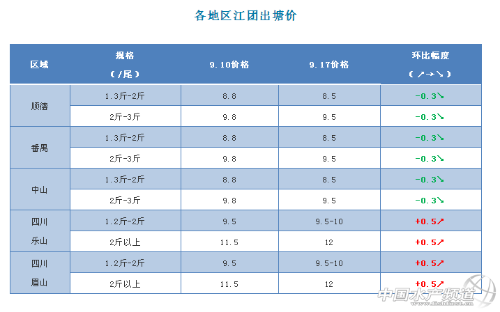 文/圖 何氏水產(chǎn)、水產(chǎn)前沿 李靜 1、與上周相比,廣東江團大小魚價格繼續(xù)下跌了0.3元/斤,主要是市場行情還沒有好轉(zhuǎn),銷量不大,氣溫還沒有明顯下降,外省水車還不支持到廣東來拉魚,預(yù)測最快要到過了國慶節(jié)才能下來。現(xiàn)在小大魚價格較8月份已經(jīng)下跌了1.2-1.8元/斤,跌幅較大,接下來價格變化不會太大。 2、四川江團本地新魚大量上市,主要以小規(guī)格為主,成交價大部分是9.5元/斤,部分收購商不夠魚,臨時上漲到10元/斤來收魚,銷量比上周大。2斤以上存塘量不多,本地及外發(fā)銷量大,價格比上周上升了0.5元/斤。 |