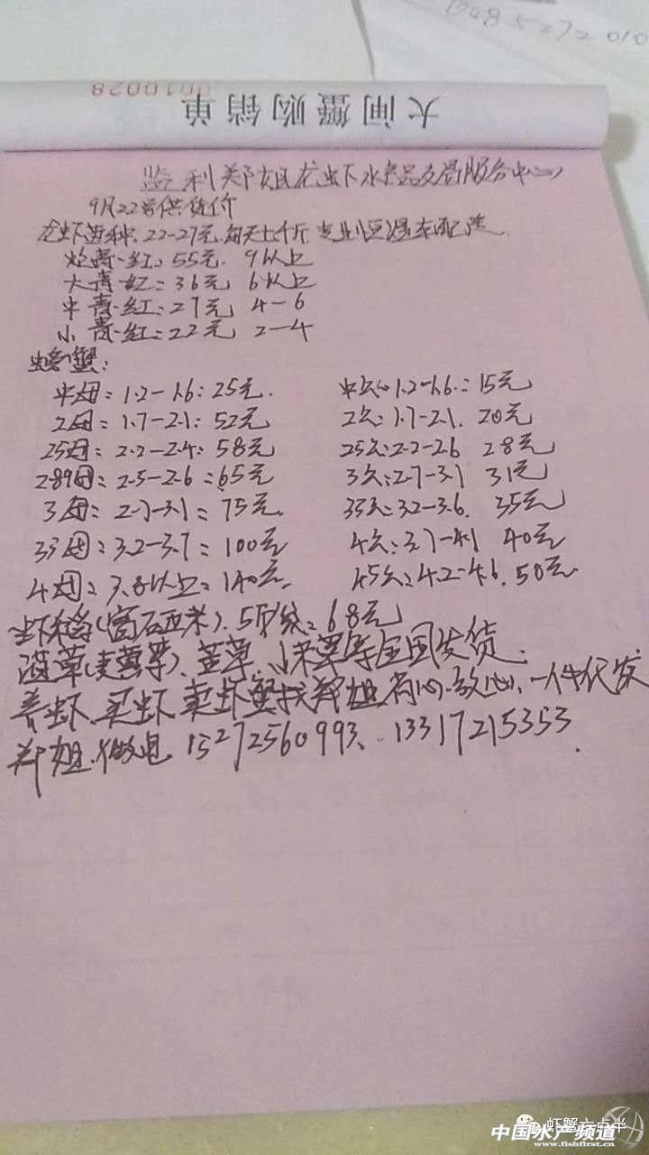 中國水產頻道報道, 報價是為了讓養殖戶能早點了解價格信息,根據行情盡量賣個好價錢。希望養殖戶朋友也能參與報價,提供價格信息,讓更多的人能更快更早的了解當天行情 2018.9.22 宜興 興化 高淳 泗洪 湖北 【關鍵字】:蝦 蟹 價格行情 水產養殖 |