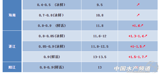 中國水產頻道原創報道, 文/ 水產前沿 彭曉君 金鯧魚 廣西區域:目前早批苗頭魚已達1斤以上,大部分魚棑都是7-8兩規格的魚,養戶陸續抓緊出魚,出魚規格以8兩以上為主。今年較多的養戶選擇六兩左右就開始出魚,這樣可以縮短養殖周期、降低風險。臺風過后魚價上漲1元左右,中秋節慶及國慶臨近,養戶大多看好魚價上漲而惜售,期待漲更高,真正成交量較少,估計國慶前會迎來出魚高峰。凍品(新魚)200/300 10元/斤(平);300/400的 11元/斤(平);400/500 12元/斤(平)。臺風過后漲價明顯,養殖戶惜售,欽防地區存排魚不多。北海區域在臺風后漲價1.5元/斤以上。近期北海區域有價無市,大部分養殖戶無出魚計劃,因為9月16日“山竹”臺風來臨前抓了部分魚到凍廠。 海南區域:價格上漲,現在大部分養殖戶都惜售,出魚量較少。 湛江區域:價格略有上漲。魚排、網箱魚規格在0.65-0.9斤/條,個別海域網箱養殖有腸炎死魚現象。 陽江區域:臺風過后,魚吃料開始恢復正常,漲價1元/斤以上。 【關鍵字】:金鯧魚 塘頭價 水產養殖 |