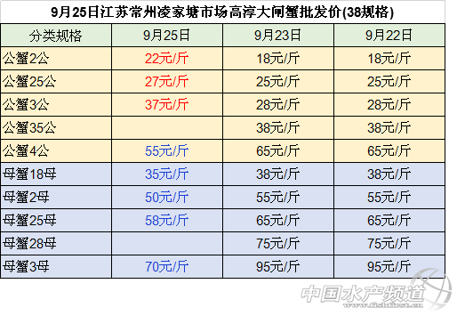 中國水產頻道整理報道,2018年9月25日南京高淳固城湖大閘蟹產地直銷價大部分價格下跌,最高下跌15元/斤。江蘇無錫蘇南水產城河蟹批發公蟹和母蟹價格均小幅下跌。江蘇常州凌家塘水產市場大閘蟹批發價格有漲有跌。江蘇泗洪縣半城鎮大閘蟹收購價格下跌。長沙馬王堆水產市場大閘蟹批發母蟹價格均小幅下跌。具體如下: 今日南京高淳固城湖大閘蟹產地直銷價大部分價格下跌:與昨日相比: 公蟹:5公、45公、4公、35公價格下跌,分別下跌15元/斤、10元/斤、8元/斤、1元/斤,3公的價格上漲了1元/斤,25公的價格保持不變; 母蟹:價格均下跌,35母、3母、28母、25母、2母和18母的價格分別下跌10元/斤、5元/斤、3元/斤、3元/斤、2元/斤和1元/斤 今日江蘇無錫蘇南水產城河蟹批發價格:與昨日相比,公蟹和母蟹價格均小幅下跌:其中, 公蟹:2公、25公和3公的價格均下跌1元/斤、35公的價格下跌3元/斤、4公的價格下跌2元/斤,45公的價格下跌5元/斤 。 母蟹:18母的價格下跌2元/斤,2母和25母的價格均下跌3元/斤、28母的價格下跌1元/斤、3母的價格下跌5元/斤、35母的價格下跌10元/斤。 今日江蘇常州凌家塘水產市場大閘蟹批發價格有漲有跌:做昨日相比: 公蟹:2公和25公、3公的價格上漲,分別上漲4元/斤、2元/斤和9元/斤,4公的價格分別下跌10元/斤; 母蟹:母蟹的價格均下跌:18母和2母的價格分別下跌3元/斤和5元/斤,25母的價格下跌7元/斤,3母的價格下跌25元/斤。 今日江蘇泗洪縣半城鎮大閘蟹收購價格下跌 :與昨日相比, 公蟹:3.5公和2公的價格小幅下跌,均下跌3元/斤,3公和15公的價格均下跌4元/斤,25公的價格價格下跌2元/斤。 母蟹:25母的價格保持不變,2母、168母、135母、1母價格均下跌,分別下跌4元/斤、4元/斤、1元/斤、2元/斤。 今日長沙馬王堆水產市場大閘蟹批發價均小幅下跌:與昨日相比, 168母蟹、2母蟹、25母蟹和28母蟹、3母的價格分別下跌10元/斤、5元/斤、6元/斤、16元/斤、18元/斤。 9月24日安徽當涂塘南水產市場精品蟹收購價格漲跌不一:與23日相比: 公蟹:45公、4公的價格下跌,均下跌5元/斤,35公的價格保持不變,3公和2.5公的價格上漲,均上漲1元/斤; 母蟹:35母、25母和2母的價格均上漲,分別上漲10元/斤、2元/斤和2元/斤,28母的價格下跌了3元/斤,3母和15母的價格保持不變。 數據來源于中國水產養殖網 |