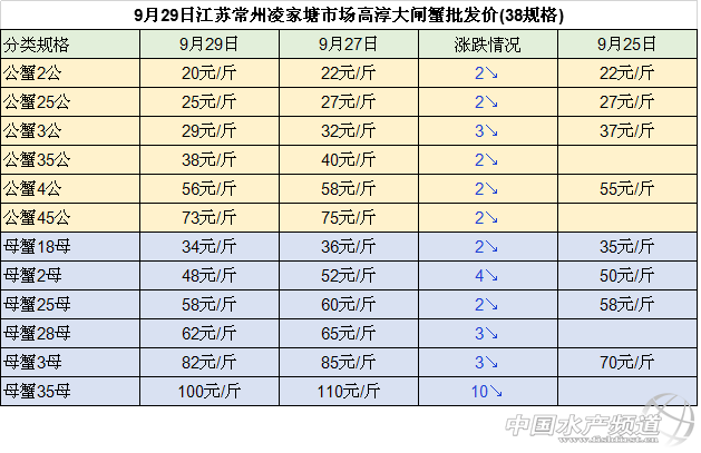 中國水產頻道整理報道,2018年9月29日江蘇無錫蘇南水產城河蟹批發價格穩中有漲,江蘇泗洪縣半城鎮大閘蟹收購價格明顯下跌,安徽當涂塘南水產市場河蟹收購價格大幅下跌,湖南益陽南縣大通湖大閘蟹批發價格穩中有跌,具體如下: 今日江蘇常州凌家塘水產市場大閘蟹批發價格與27日相比均下跌:其中, 公蟹:2公、25公、35公、4公、45公價格均下跌2元/斤,3公的價格下跌3元/斤。 母蟹:18母和25母的價格下跌2元/斤,2母的價格均下跌4元/斤,28母和3母的價格均下跌3元/斤,35母的價格下跌10元/斤,價格為100元/斤。 今日江蘇無錫蘇南水產城河蟹批發價格穩中有漲: 公蟹:2公、25公、3公的價格均保持不變,35公、4公和45公的價格均上漲1元/斤。 母蟹:18母、2母、25母、28母、3母的價格均上漲1元/斤,35母的上漲5元/斤,價格為110元/斤。 今日江蘇泗洪縣半城鎮大閘蟹收購價格下跌明顯: 公蟹:35公和3公的價格均下跌5元/斤,25公的價格下跌3元/斤,2公和15公的價格均下跌4元/斤。 母蟹:2母的價格下跌9元/斤,168母的價格下跌5元/斤、135母的價格下跌4元/斤,1母的價格下跌2元/斤。 今日安徽當涂塘南水產市場河蟹收購價格大幅下跌: 公蟹:5公的價格為80元/斤,45公的價格下跌13元/斤,4公的價格下跌8元/斤,35公和25公的價格均下跌4元/斤,3公的價格下跌3元/斤; 母蟹:35母的價格為110元/斤,3母、28母、25母和2母的價格均下跌5元/斤,15母的價格下跌2元/斤。 今日湖南益陽南縣大通湖大閘蟹批發價格較昨日相比穩中有跌 : 公蟹:3公、35公和4公的價格均保持不變,45公的價格大幅下跌,下跌了 20元/斤; 母蟹:1.3-1.7兩 母蟹的價格保持不變,2母和25母的價格下跌3元 /斤,28母 的價格下跌10元/斤,3母的價格下跌5元/斤,35母的價格下跌12元/斤,價格為98元/斤。 數據來源于中國水產養殖網 |