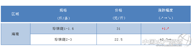 中國水產(chǎn)頻道原創(chuàng)報道, 文/ 水產(chǎn)前沿 植銀素 2018年9月29日海南1-1.6斤/條的珍珠斑的價格為31元/斤,上漲了1元/斤,2-3斤/條的珍珠斑價格為22.5元/斤,價格保持穩(wěn)定。 【關(guān)鍵字】:石斑魚 塘頭價 水產(chǎn)養(yǎng)殖 |