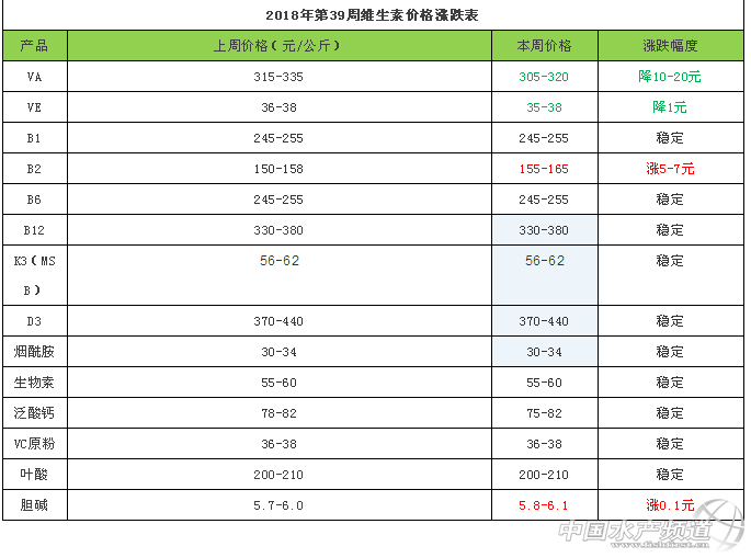 根據慧通數據研究部的初統數據顯示: VA 本周VA市場報價305-320元/公斤,7月2日BASF宣布解除VA、VE產品不可抗力,產品逐步恢復供應。近日廠家出貨價格下調,國內VA市場隨之回落,7月中旬起新和成VA工廠計劃停產檢修10周,市場消息稱檢修時間或延長,外媒報道稱BASF在路德維希港的VA擴建項目啟動,預計在2020年投產,歐洲市場VA1000市場報價65-70歐元/公斤,國內市場弱勢運行。 VE 本周VE市場報價35-38元/公斤,新和成計劃從2018年8月初到2018年9月維生素E車間停產檢修5周,BASF恢復產品供應,豬瘟疫情不利于需求,VE市場低位運行。歐洲市場報價小幅回調至4-4.1歐元/公斤。 泛酸鈣 本周市場報價在75-82元/公斤左右,近日市場消息稱有廠家恢復報價75-76元/公斤,市場價格震蕩整理。 煙酰胺 本周市場報價30-34元/公斤。受新產能釋放及需求低迷影響,煙酰胺價格較長時間于低位運行,此前有進口廠家報價36元/公斤,下游庫存偏大抑制漲幅,凡特魯斯7月1日起上調3-甲基吡啶價格10%,近日煙酰胺市場穩中整理。 D3 本周市場報價370-440元/公斤左右,6月份部分廠家曾大幅提高報價,部分廠家停報,需求不佳,近期市場報價震蕩回調,8月24日臺州海盛提高飼料級D3產品報價至1000元/公斤,下游需求不佳,經銷商報價偏弱震蕩。 B1 本周市場報價在245-255元/公斤左右。7月24日兄弟科技最新公告表示江蘇兄弟公司已完成復產的各項工作,已正式恢復生產。近日市場需求不佳,經銷商報價震蕩整理。 B2 本周市場報價在155-165元/公斤左右。 此前有廠家報價160元/公斤,8月31日廣濟藥業公告稱,孟州公司于9月1日起恢復生產。近日部分廠商停止報價發貨偏緊,市場消息稱有停報廠商現提價意愿,市場購銷偏活躍,報價小幅上漲。 B6 本周市場報價245-255元/公斤左右,惠生藥業復產時間不確定,6月27日天新藥業受原料影響提高B6產品報價10%。近日市場需求不佳,經銷商報價窄幅震蕩。 B12 本周市場報價330-380元/公斤左右,首輪環保督查期間廠家生產受影響,提價頻頻,此前部分廠家提價至450-500元/公斤,終端企業對高價格心態謹慎,此前B12報價震蕩回調,而寧夏地區環保嚴格,泰瑞制藥事件發酵受關注,B12市場報價反彈,穩中偏強運行。 2%生物素 本周市場報價55-60元/公斤, 前期廠家停報或小幅提價,下游企業積極補貨。因原料價格上漲,7月2日天新藥業提高生物素報價至60元/公斤。8月2日,帝斯曼公司在中國起訴安徽泰格專利侵權。受環保影響,9月生物素廠家停產時間延長,市場關注有所增加。 葉酸 本周市場報200-210元/公斤左右。原料貨緊提價,7月12日天新提高葉酸報價至240元/公斤,環保嚴格,原料上漲,市場關注有所增加,近日葉酸市場價格穩中整理。 K3 本周(MSB)K3市場報價56-62元/公斤,市場消息稱部分廠家停報停簽存提價意愿,市場需求不佳,K3市場震蕩整理。 VC 本周市場報價37-39元/公斤左右,前期廠家報價疲軟,下游需求不佳,VC市場成交偏淡,而出口量大存有支撐,此前帝斯曼公告稱江山制藥工廠升級改造,自2018年7月開始關閉4個月,近日VC市場價格波動不大。 |