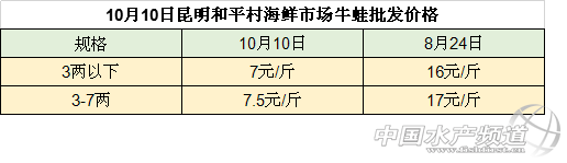 今日浙江寧波路林水產市場牛蛙批發價格如下:3-6兩的牛蛙價格為8.3元/斤,5-8兩的價格為8.5元/斤。 今日海小江陽水產市場牛蛙批發價格如下:5-8兩的牛蛙價格為7.2元/斤,9兩-1.2斤的牛蛙價格為7.4元/斤 今日昆明和平村海鮮市場牛蛙批發價格如下:3兩一下的牛蛙價格為7元/斤,3-7兩的牛蛙價格為7.5元/斤。 數據來源于中國水產養殖網 |