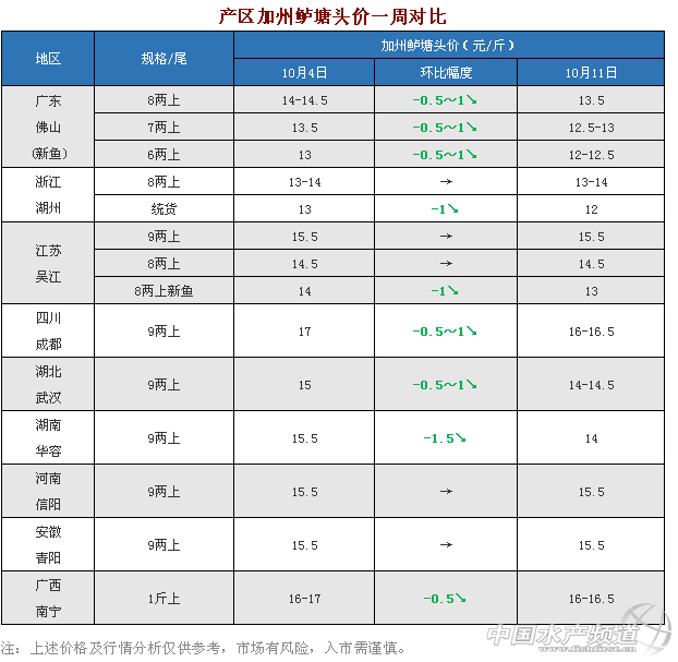 文/圖 水產(chǎn)前沿 李曉欣 本周,各地加州鱸塘頭價(jià)穩(wěn)中有降。目前廣東加州鱸舊魚(yú)已經(jīng)清空,隨著新魚(yú)上市量逐漸增多,各規(guī)格新魚(yú)價(jià)格均下跌了0.5-1元/斤。全國(guó)魚(yú)價(jià)看廣東,受廣東魚(yú)價(jià)下滑影響,本周浙江、江蘇、四川、湖北、湖南、廣西地區(qū)加州鱸塘頭價(jià)也有所下跌,跌幅最高達(dá)1.5元/斤。 按照往年行情走勢(shì),預(yù)計(jì)接下來(lái)加州鱸塘頭價(jià)還將繼續(xù)下行,建議養(yǎng)殖戶朋友理性看待魚(yú)價(jià)走勢(shì),合理選擇時(shí)機(jī)出魚(yú),確保養(yǎng)殖收益。 本周各產(chǎn)區(qū)行情簡(jiǎn)析 廣東佛山 目前佛山區(qū)域的加州鱸舊魚(yú)已經(jīng)清空,新魚(yú)在國(guó)慶以來(lái)上市量加大,魚(yú)價(jià)低走,今天報(bào)價(jià)6兩上12-12.5元/斤,7兩上12.5-13元/斤,8兩上13.5元/斤,實(shí)際成交價(jià)格看魚(yú)頭大小和8兩上比例。近期出魚(yú)以6兩上和7兩上為主,市場(chǎng)上大規(guī)格魚(yú)比較緊缺,魚(yú)中挑魚(yú)對(duì)魚(yú)頭要求較為嚴(yán)格。 浙江湖州 本周湖州8兩上加州鱸持穩(wěn)在13-14元/斤,統(tǒng)貨主要看8兩上成次,7成以上報(bào)價(jià)12元/斤左右,相比上周跌了1元/斤。目前湖州已有部分新口鱸魚(yú)上市,有魚(yú)中挑標(biāo)魚(yú)13.5元/斤,預(yù)計(jì)月底上市量會(huì)增多。 江蘇吳江 今天吳江老口8兩上報(bào)價(jià)為14.5元/斤,9兩上15.5元/斤,魚(yú)價(jià)一周企穩(wěn)。吳江有部分新口上市,8兩上報(bào)價(jià)13元/斤,比上周14元/斤跌了1元/斤。目前吳江地區(qū)新口上市還比較少,老口鱸魚(yú)還有一定存塘,預(yù)計(jì)本月底才能出完。 四川成都 今天報(bào)價(jià)9兩上16-16.5元/斤,相比上周17元/斤下跌了0.5-1元/斤。四川地區(qū)老口鱸魚(yú)已基本清完,有部分新口開(kāi)始上市,預(yù)計(jì)10月底上市量將會(huì)增多,屆時(shí)魚(yú)價(jià)會(huì)有所調(diào)整。 湖北武漢 受廣東新魚(yú)沖擊市場(chǎng)影響,本周武漢魚(yú)價(jià)有所下滑,9兩上價(jià)格從15元/斤跌至14-14.5元/斤,跌幅0.5-1元/斤。武漢老口鱸魚(yú)預(yù)計(jì)十月底清完,現(xiàn)在當(dāng)?shù)匾延胁糠中卖~(yú)上市,9兩上12.5-13元/斤。 湖南華容 本周華容加州鱸塘頭價(jià)下滑幅度較大,9兩上價(jià)格從15.5元/斤跌至14元/斤,跌幅達(dá)1.5元/斤。國(guó)慶期間華容加州鱸銷量走俏,有魚(yú)中平時(shí)走四五千斤,到國(guó)慶每天走兩萬(wàn)斤左右。受廣東魚(yú)價(jià)下跌影響,華容當(dāng)?shù)佤~(yú)價(jià)也有所下調(diào)。 安徽青陽(yáng) 本周青陽(yáng)加州鱸塘頭價(jià)持穩(wěn),9兩上15.5元/斤。國(guó)慶期間青陽(yáng)銷量走俏,每天有4-5車的出魚(yú)量,節(jié)后銷量有所下降,每天維持在1-2車。目前青陽(yáng)老口鱸魚(yú)存塘不多,加上魚(yú)價(jià)同比去年較低,養(yǎng)戶出魚(yú)積極性不高。 河南信陽(yáng) 本周信陽(yáng)9兩上加州鱸塘頭價(jià)維持在15.5元/斤,當(dāng)?shù)乩峡诖嫣烈呀?jīng)不多,大多新口還未達(dá)上市規(guī)格,流通商多選擇到吳江拉魚(yú)。 廣西南寧 廣東新魚(yú)增多上市,對(duì)南寧市場(chǎng)有一定沖擊,本周廣西加州鱸塘頭價(jià)從17元/斤下跌至16-16.5元/斤,跌幅0.5-1元/斤。廣西當(dāng)?shù)匦卖~(yú)預(yù)計(jì)本月底開(kāi)始上市,接下來(lái)魚(yú)價(jià)還將有所回落。 |