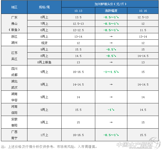 文/圖 水產前沿 李曉欣 今天廣東佛山加州鱸6兩上報價11.5元/斤,7兩上12元/斤,8兩上12.5-13元/斤,各規格相比13日報價時均下跌了0.5-1元/斤,實際成交價根據魚頭大小和8兩上比例而定。 受廣東魚價下跌影響,江蘇、四川、河南、廣西加州鱸塘頭價也有所下滑,跌幅最高達1.5元/斤。 半個月跌2元/斤,廣東魚價呈下行態勢 10月以來,隨著新魚的大量上市,廣東佛山加州鱸塘頭價逐漸回落,7兩上塘頭價從月初的13.5-14元/斤下調至今天的12元/斤,半個月時間跌幅達2元/斤。 對于魚價下滑,大多人持“淡定”態度。按照往年行情走勢,每年10月份隨著新魚的大量上市,魚價下滑屬于正常現象。從上圖可以看出,去年同期7兩上加州鱸達13-13.5元/斤,下旬開始逐漸下滑至月底的10.5元/斤,跌幅達3元/斤。目前魚價相比去年同期低1-1.5元/斤,預計接下來魚價將繼續呈下行態勢。 廣東魚沖擊外地市場,四省跌幅最高1.5元/斤 受廣東魚沖擊市場影響,四個產區加州鱸塘頭價變動大。江蘇吳江老口鱸魚下跌了0.5元/斤,今天報價8兩上14-14.5元/斤,9兩上15元/斤;四川9兩上加州鱸今天報價15元/斤,相比13日報價16-16.5元/斤下跌了1-1.5元/斤;河南信陽9兩上加州鱸從15.5元/斤跌至14.5元/斤,跌幅1元/斤;廣西南寧1斤上加州鱸從16-16.5元/斤下跌至15.5元/斤,跌幅0.5-1元/斤;其他產區基本持穩。 今日加州鱸價一覽 |
