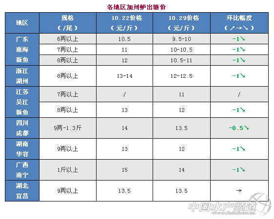 中國水產頻道原創報道, 文/圖 何氏水產 水產前沿 李靜 加州鱸 1、廣東鱸魚新魚本周全線再下跌了1元/斤,6兩以上9.5-10元/斤,7兩以上10-10.5元/斤,8兩以上10.5-11元/斤,最終成交價還是看魚頭以及8兩以上的比例來定價的。現在廣東新魚各大主產區的存塘量還有挺多,養戶擔心后續價格還會下降,都在排隊出魚,現在存塘量的魚還是以1.2-1.3斤魚頭為主,1.5-1.6斤魚頭的還是不多。本周銷量比上周多一點,主要是其他主產區的老魚都出完了,現在都在出新魚,魚頭也不大,將一部分銷量都轉回廣東了,接下來鱸魚價格持穩或許有小幅的下滑,但空間不大。 2、浙江湖州現在新魚在大量上市,本周價格比上周價格下跌了1元/斤左右,銷量不多。江蘇吳江老魚基本結束了,現在在出新魚,7兩以上11元/斤,8兩以上12元/斤,價格下跌了1元/斤,目前塘頭都是出8兩以上魚為主,銷量穩定。預測接下來價格或許會持穩,養戶惜售。湖北宜昌老魚9兩以上價格不變,四川成都、廣西南寧、湖南華容新魚在大量上市,價格都比上周繼續下跌了0.5-1元/斤。 |