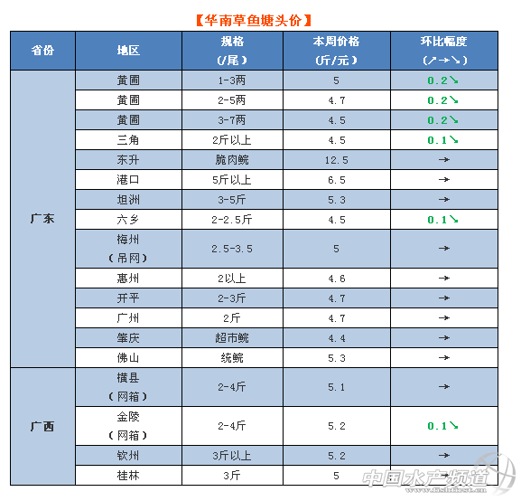 中國水產頻道原創報道, 文/圖 水產前沿 鄭鵬飛 一周要聞 1.隨著最新一股冷空氣的南下,11月3日甘肅、青海、吉林都迎來了2018年的第一場雪,北京部分地區也已經飄起了雪花。全國大部分地區都進入一輪雨雪降溫天氣,局部降溫幅度甚至達到14℃。不過,目前廣東大部分地區氣溫仍維持在20℃以上,廣州白天最高氣溫甚至達到28℃。真正是北方穿棉褲,廣東穿短褲。冷空氣的南下對于魚價行情無疑是一個利好消息,期待這次冷空氣過后草魚價格能有所回升! 2.從最新市場了解到的情況來看,本周全國大部分地區草魚價格仍然還處在低迷狀態。目前,有很多地區的草魚價格已經跌破成本線,好一點的也基本在成本線上下徘徊。從養殖戶了解到,目前肇慶地區的最新草魚塘頭價4.4元/斤,而單斤魚養殖成本基本都在4.2元左右,養殖中死魚比較嚴重的基本就要虧本了。也有資深業內人士表示,面對今年低迷的草魚行情很多養殖戶是要虧本的。 3.對于養殖戶來講,最近一個比較好的消息就是:飼料原料價格下降了。受國內外市場影響,這兩天大豆和豆粕價格出現下跌,豆粕價格暴跌310元/噸,11月5日最新報價3450元/噸。隨著原料價格的下降,預計飼料降價應該也不遠了。 今日行情 華南地區 中山:本周中山地區草魚成魚和苗種行情一樣低迷。從流通商了解到,目前大涌地區1-3兩的草魚賣5元/斤,2-5兩的賣4.7元/斤,3-7兩多賣4.5元/斤,整體較上周下滑0.2元/斤。由于成品魚銷量低迷,目前苗種的走量也不大。養殖戶表示,目前草魚存塘量太大,都不知道什么時候能漲。今年沒希望了,即使上漲漲幅也不會很大。 江門:有養殖戶表示,目前江門地區2-5兩的草魚最新塘頭價4.3元/斤,3-7兩的賣4.2元/斤,1-2斤的草魚賣4.2元/斤,預計元旦之后價格會上漲。 肇慶:目前肇慶地區草魚最新塘頭價4.4元/斤。養殖戶表示,單斤魚成本價差不多要4.2元/斤,目前大部分養殖戶都不想賣魚,賣了也是虧本,還不如不買。 佛山:養殖戶表示,佛山南海區周邊草魚存塘太多,估計近期價格很難上漲。本周最新報價仍維持在上周水平。 惠州:從業內人士了解到,目前惠州惠城區草魚最新塘頭價4.6元/斤,草魚行情依然很低迷。 廣西:據養殖戶介紹,廣西桂平和梧州地區網箱預計在11月15日結束,期待在網箱結束之后草魚價格能有所回升。目前,桂林地區草魚最新塘頭價5元/斤;貴港地區草魚最新塘頭價5.2元/斤,繼續維持上周水平。 華中地區 江西:本周江西草魚行情仍然很低迷。南昌地區2-3斤的草魚最新塘頭價4.5元/斤;贛州地區3-4斤的網箱草魚賣5.2元/斤,4-5斤的賣5.4元/斤,5斤以上的賣5.8元/斤。養殖戶表示,目前吉安地區草魚太多了賣不出去,價格一跌再跌,已經跌破成本價了。目前九江地區草魚最新塘頭價4.3元/斤,養殖戶表示預計草魚年底即使漲也不會很理想,明年的草魚價格會好一點,2020年草魚能達到2017年的價位。 湖南:本周湖南草魚再次出現小幅下滑。有養殖戶表示,今天剛剛賣往郴州的一批8000斤的草魚上車價4.5元/斤。 湖北:本周湖北部分地區草魚行情出現小幅回升。從養殖戶了解到,今天拉到白沙洲批發市場的標草的價格是4.7元/斤。 華東地區 江蘇:本周江蘇大部分地區的草魚價格還是保持平穩,沒有出現明顯變化。目前淮安地區草魚最新塘頭價4.2-4.3,價格平穩。有業內人士表示,雖然養殖戶和流通商都希望草魚價格能漲回來,但是目前的價格還是持續低迷,沒有漲也沒有跌。 福建:好消息是,有養殖戶表示最近三明地區小部車的價格已經漲到5.7元/斤了。不過,本周福建大部分地區草魚還是難賣,目前誰都不愿意賣魚,期待后期能有個好行情。 浙江:有養殖戶表示,隨著天氣轉涼草魚銷量應該會有所增加,但是價格一時半會估計不會上漲。目前衢州地區草魚最新抬網價格4.6元/斤,已經接近成本價了,銷量不大。今年的草魚行情主要還是受拆網箱和退耕還田等強制措施的沖擊影響,希望未來養魚會有好的發展。 其他地區 四川:目前成都地區草魚最新報價6元/斤,但是銷量不好;廣元地區大部分草魚賣價在5.6-5.8元/斤,發給小販的價格最高再6.5元/斤;涼山地區5斤的草魚最新塘頭價5.2元/斤。 陜西:從養殖戶了解到,目前漢中地區草魚最新塘頭價5元/斤。 遼寧:最近遼寧沈陽地區草魚行情依然低迷,最新塘頭價4.5-4.6元/斤。 河北:目前唐山地區還是草魚多,市場需求量小。目前唐山地區最新草魚塘頭價4.7-4.8元/斤,價格變化不大,套養的1.3-1.4斤草魚賣3.7-3.8元/斤。有流通商表示,預計在魚塘結冰前草魚價格能回到5元/斤。目前大部分養殖戶都在出鯉魚,天津西津賣魚已經基本接近尾聲,目前1-1.5斤的草大部分都轉塘了,養殖戶表示預計明年上半年行情可能還是不會太好。 甘肅:流通商表示,目前蘭州地區草魚最新報價5.5-6.2元/斤,相比上周有小幅上漲,但是目前價格波動比較大,漲幅不定。 云南:由于最近湖南地區草魚也開始進入昆明市場,最近當地草魚又下滑了0.5元/斤,從上周的13.5元/公斤下滑到12.5元/公斤,最低報價12.3元/公斤。流通商表示,預計近期魚價不會上漲。 |
