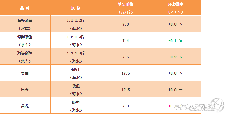 文/ 珠海海龍 水產(chǎn)前沿 吳佳輝 中國(guó)水產(chǎn)頻道原創(chuàng)報(bào)道,2018年11月9日海鱸、立魚、盲曹、黃花塘頭價(jià)格如下: 本周鱸魚新魚存塘較多,且臨近交塘期,飼料廠家結(jié)賬期,故出魚量巨大,跌至成本價(jià),后市預(yù)計(jì)繼續(xù)出魚高位。舊魚存塘及需求極少,價(jià)格下滑較快,后市預(yù)計(jì)穩(wěn)定。 立魚價(jià)格穩(wěn)定。 盲曹價(jià)格穩(wěn)定,統(tǒng)級(jí)11.5元/斤。 黃花價(jià)格較上周上漲3毛,目前市場(chǎng)存塘較少。 2018年11月9海鱸、立魚、盲曹、黃花塘頭價(jià)格 欲了解更多關(guān)于海鱸價(jià)格行情的內(nèi)容請(qǐng)進(jìn):http://m.fuqitext.com/portal.php?mod=list&catid=57 |