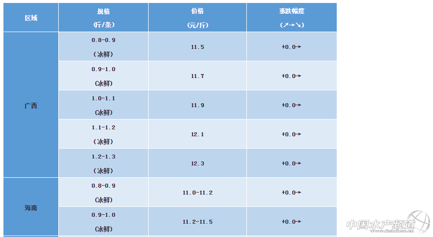 文/ 水產前沿 植銀素 中國水產頻道原創報道,廣西區域:目前規格魚存量大幅度減少,近期由于天冷厭料,加上擔心臺風風險,出魚較多,本周魚價較為穩定,冰鮮和凍品均與上周持平。凍品:(新魚)200/300-10.25元/斤(平);300/400-12元/斤(平);400/500-12.75元/斤(平);500/600-13.25元/斤(平);600/700-13.75元/斤(平)。 湛江區域:本周價格略有上漲,受小瓜蟲影響部分網箱有出現死魚現象。 ※上述報價可能會因區域、規格、品質和時間等因素的不同而會產生差異,在此僅供參考。環比幅度以本周價格與上周價格數據做對比 【關鍵字】:金鯧魚 金鯧魚價格 水產養殖 |