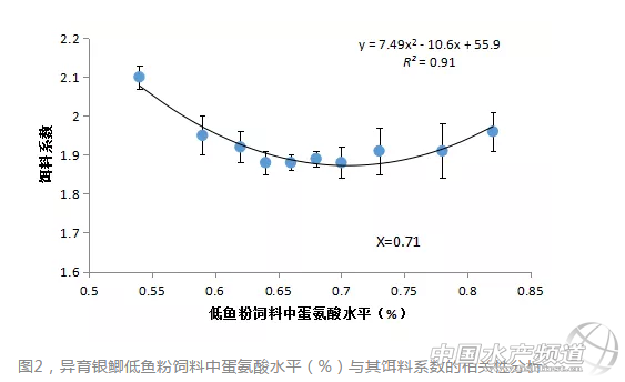 中國水產頻道原創報道,異育銀鯽(Carassius auratus gibelio)為我國廣泛養殖的主要淡水品種之一,具有生長快和風味佳等特點(Xue和Cui,2001)。2017年,異育銀鯽年總養殖產量超過281萬噸(中國漁業統計年鑒,2018)。異育銀鯽的商業飼料中魚粉含量通常在15-20%,但隨著水產養殖業的快速發展,魚粉已供不應求,價格也在不斷上漲,尋找魚粉替代品受到廣泛關注。研制低魚粉飼料可以有效降低水產飼料產業對魚粉的依賴,保證水產養殖業可持續性發展。 文/ 贏創德固賽(中國)投資有限公司動物營養業務線 肖緒誠,高俊 本研究的目的,詣在利用植物蛋白源降低異育銀鯽飼料中魚粉用量,同時添加水產專用DL-蛋氨酸TM(DL-Methionine for AquacultureTM),確定異育銀鯽的低魚粉飼料中最適蛋氨酸和總含硫(TSAA)的含量,以期為制定低魚粉異育銀鯽商業飼料配方提供合理有效的技術支持。 材料和方法 實驗開始前,將均重為6.7g的1080尾異育銀鯽隨機分養到36個玻璃纖維缸的室內循環水實驗系統中,實驗水體為300L,養殖密度為30尾/缸。實驗分為12個處理組,每組三個平行。實驗持續10周,實驗期間平均水溫為26±0.5℃,溶氧大于6.0mg/L。每天四次飽食投喂。 本實驗以魚粉,雞肉粉,豆粕,菜粕和棉粕為主要蛋白源,配置12種等氮等能(36%蛋白,19MJ/kg)飼料飼喂異育銀鯽,包括正對照組(PC1和PC2),負對照組(NC)和負對照組飼料補充九種不同水平的水產DL-蛋氨酸TM處理組(如表1和表2所示)。其中正對照組飼料PC1中含有15%魚粉(飼料1),為商業飼料配方組,沒有額外補充晶體氨基酸,其蛋氨酸含量為6.2g/kg。正對照組PC2(飼料2)為商業飼料配方組補充水產DL-蛋氨酸TM,以達到飼料氨基酸平衡(異育銀鯽肌肉氨基酸含量)的處理組,其蛋氨酸含量為7.8g/kg。負對照組NC(飼料3)為低魚粉組飼料(5%魚粉),該組飼料按照氨基酸平衡模式只補充晶體賴氨酸和蘇氨酸,沒有額外補充蛋氨酸,其蛋氨酸水平為5.4g/kg。飼料4至飼料12為負對照組飼料基礎上添加不同水平的水產DL-蛋氨酸TM,使其飼料蛋氨酸水平分別為5.9、6.2、6.4、6.6、6.8、7.0、7.3、7.8和8.2g/kg(半胱氨酸含量為5.2g/kg)。 主要結果 異育銀鯽生長性能指標如表3所示。飼喂不同蛋氨酸含量飼料的異育銀鯽,其存活率無顯著差異。5%魚粉組(NC)魚體的特定生長率(SGR)最低,而餌料系數最高(p<0.05)。而5%魚粉組補充不同水平的晶體水產DL-蛋氨酸TM后,可顯著提高魚體特定生長率,有效降低餌料系數。當5%魚粉組飼料中添加0.1-0.2%水產DL-蛋氨酸TM后,其飼喂的魚體生長性能和15%魚粉組無顯著差異。二次方程回歸分析得出,在低魚粉情況下,異育銀鯽飼料最適蛋氨酸水平為7.1g/kg,總含量氨基酸含量為12.3g/kg。 主要結論 外源添加水產DL-蛋氨酸TM可有效降低飼料中的魚粉使用量,保證魚體的正常生長性能。5%魚粉組飼料中添加0.1-0.2%的水產DL-蛋氨酸TM(總蛋氨酸含量6.4-7.3g/kg)與15%魚粉組的魚體生長性能無顯著差異。 二次回歸分析得出,在低魚粉異育銀鯽飼料中,最適蛋氨酸含量和總含硫氨基酸含量分別為7.1g/kg和12.3g/kg(圖1)。且本實驗飼料中添加0.18%的水產DL-蛋氨酸TM可達到其最適蛋氨酸水平。 低魚粉飼料的餌料系數,隨著晶體DL-蛋氨酸TM添加量的增加而顯著降低。當飼料的蛋氨酸含量達到7g/kg(添加0.18%的水產DL-蛋氨酸TM)時,鯽魚餌料系數最低(圖2),且和正對照處理組(PC2)無顯著差異。 |