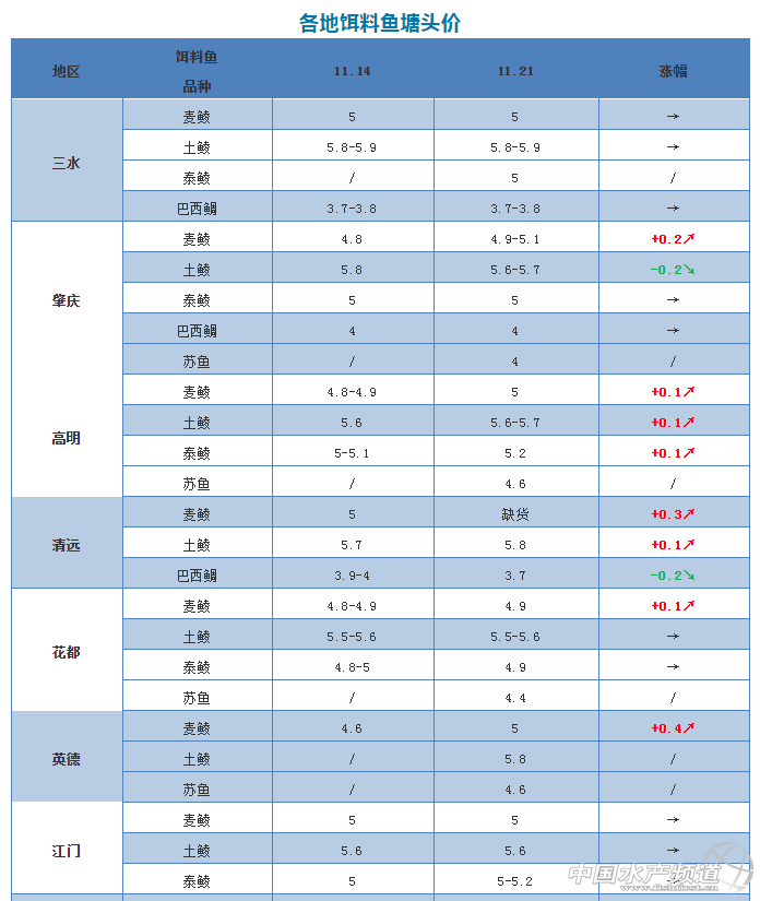 中國水產頻道原創報道,今年是鱖魚價格同期相對最高的一年,也是臭鱖魚加工廠相對最艱難的一年 文/圖 水產前沿 李靜 本周,各地鱖魚幾乎全線上漲。廣東、江蘇、湖南、湖北、江西、安徽、山東七省分別上漲0.5-1元/斤,唯一還沒調價的廣西也有可能近日上漲。為什么今年各地鱖魚價格不僅不跌還漲勢強勁呢?可能主要還是跟廣東鱖魚養殖成本高企,養戶惜售有關。 今天,廣東鱖魚開塘價格表現比較混亂,30-31元/斤都有,但這個價位還未達養戶預期,惜售心理仍然較強。而終端市場需求并沒有什么起色,只是臭鱖魚加工廠的凍庫缺口很大。今年是鱖魚價格同期相對最高的一年,也是臭鱖魚加工廠相對最艱難的一年,臭鱖魚加工廠在高漲的鱖魚原料面前進退兩難。 本周,各地餌料魚價格整體保持高位運行或穩中有升,部分地區巴西鯛跌幅明顯。 |