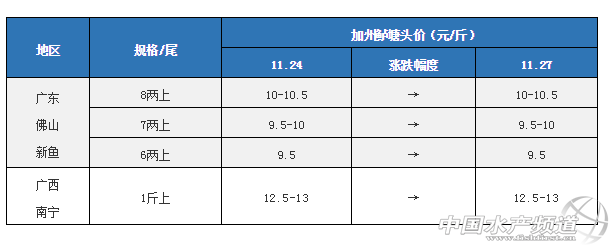 中國水產頻道原創報道,11月27日加州鱸塘頭報價及行情分析 文/圖 水產前沿 李曉欣 產區加州鱸塘頭價及行情簡析 華南地區 廣東佛山:今天佛山加州鱸新魚6兩上報價9.5元/斤左右,7兩上9.5-10元/斤,8兩上10-10.5元/斤,具體看魚頭大小及8兩上比例定價。目前魚價已經維持了近20天,由于價格低迷,養戶出小規格魚的意愿不高,寧愿放回魚塘養大再賣。隨著存塘大魚比例逐漸升高,養戶擔心存魚超標都以出大規格魚為主,外省流通商到佛山收魚增多,銷量有所上升,預計短期內魚價還是以維穩為主。 廣西南寧:南寧今天1斤上加州鱸報價12.5-13元/斤,魚價企穩。南寧本地魚達上市規格的還比較少,當地流通商多到廣東拉魚。 華東地區 浙江湖州:今天8兩上加州鱸報價10-10.5元/斤,統貨報價9-9.5元/斤,實際成交價看魚的成次。由于統貨魚價便宜,湖州當地魚中很少愿意收標魚,養戶以出統貨為主。湖州養戶為了減輕存塘壓力,出魚積極性較高。 江蘇吳江:吳江加州鱸今天報價7兩上10元/斤,8兩上10.5元/斤。由于魚價低迷,利潤空間較小,吳江養戶現在基本很少出魚。 華中地區 湖北武漢:今天武漢9兩上加州鱸報價10.5-11元/斤左右,目前魚價已經持穩了近一個月,由于魚價未達預期,當地養戶出魚意愿不強,本地銷量不大,市場以廣東魚為主。 湖南華容:華容9兩上加州鱸價格已持穩了超半個月,今天報價11元/斤。據悉,現在華容標魚所剩不多,當地出魚量有所減少。 西南地區 四川成都:成都今天9兩上報價12元/斤,當地銷量仍然較大,由于魚價較為低迷,部分養戶開始惜售。 |