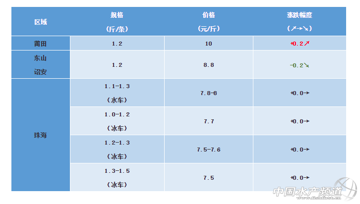 摘要: 中國水產頻道原創報道, 海鱸福建莆田、東山、詔安區域:鱸魚均已達到上市規格,存塘規格在1.2-1.6。福建地區鱸魚銷售主要活魚為主,莆田地區本地收魚量減少,本周價格稍有上漲,同比上周上漲0.2元/斤;詔安、東山市 ...