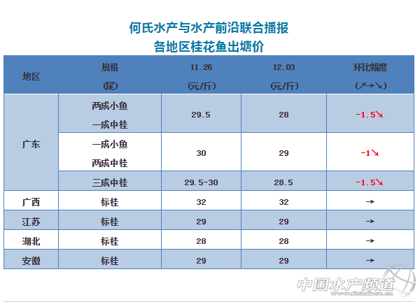 2、本周外省四大桂魚產區的塘頭價持穩,出魚量相對之前有所下降,主要受當地天氣影響,預計本月上旬出魚量會保持穩定,下旬可能會慢慢下降。