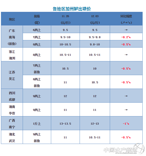 2、浙江湖州新魚(yú)存塘量還較多,價(jià)格與上周一樣,依然是10.5-11元/斤,銷(xiāo)量比上周大,有部分附近產(chǎn)區(qū)的收購(gòu)商到該地收魚(yú)。受廣東鱸魚(yú)價(jià)格影響,江蘇吳江鱸魚(yú)價(jià)格下滑了0.5元/斤,7兩以上10元/斤,8兩以上10.5元/斤。由于價(jià)格達(dá)不到預(yù)期,養(yǎng)戶出魚(yú)意愿不高,銷(xiāo)量不多,預(yù)測(cè)接下來(lái)價(jià)格或會(huì)持穩(wěn),養(yǎng)戶惜售。四川成都鱸魚(yú)9兩以上還是12元/斤,銷(xiāo)量與上周差不多。廣西南寧、湖北武漢新魚(yú)開(kāi)塘價(jià)比上周下跌了0.5-1元/斤,湖南華容價(jià)格與上周一樣,銷(xiāo)量穩(wěn)定。 |