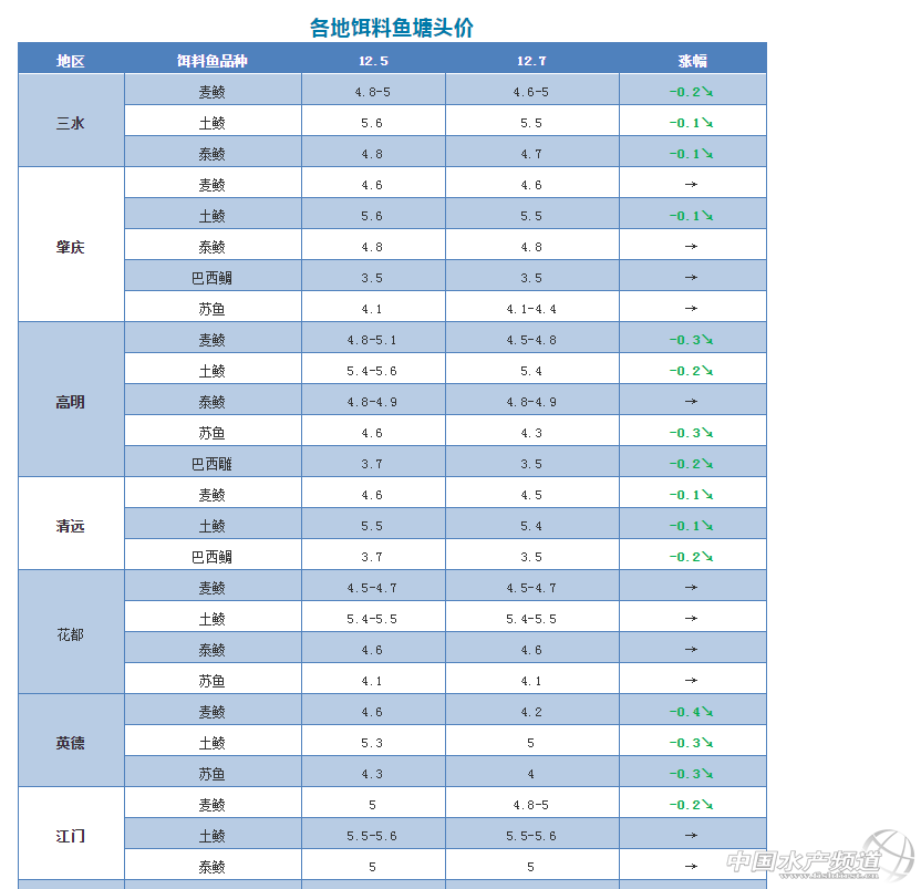 中國水產頻道原創報道,廣東一夜入冬,北方多地大雪,鱖魚價格漲勢明顯 文/圖 水產前沿 李靜 今天是二十四節氣中的大雪,江蘇、安徽、湖南等多地迎來了入冬后的第一場雪。 視頻:今日江蘇無錫大雪場景 受冷空氣影響,鱖魚養戶惜售,今天廣東鱖魚塘頭訂魚價格再漲0.5元/斤,不少地方是30元/斤才給看魚。眼下,雖然塘頭價格穩中有升,市場批發價也略有上浮,但整體來說流通商抓魚風險還是比較高,超過30元/斤虧本可能比較大。 視頻:今日廣東肇慶魚中拋魚打樣 受大雪天氣影響,今天安徽、山東標桂也分別上漲了0.5元/斤,江蘇、江西、湖南、湖北、廣西鱖魚價格預計也將很快上調。各地鱖魚價格有望全線上漲。 這場冷空氣來勢洶洶,部分養戶擔心餌料魚低溫凍死而清塘,導致這兩天餌料魚價格跌幅明顯。三水麥鯪、土鯪、泰鯪分別跌了0.1-0.2元/斤左右;肇慶土鯪跌了0.1元/斤左右;高明麥鯪、土鯪、蘇魚、巴西雕分別跌了0.2-0.3元/斤左右;清遠麥鯪、土鯪、巴西雕分別跌了0.1-0.2元/斤左右;英德麥鯪、土鯪、蘇魚分別跌了0.3-0.4元/斤左右;江門麥鯪跌了0.2元/斤左右;四會麥鯪、土鯪、泰鯪、蘇魚分別跌了0.2-0.4元/斤左右;順德土鯪跌了0.1元/斤左右;其他地區的價格暫時保持穩定。 |