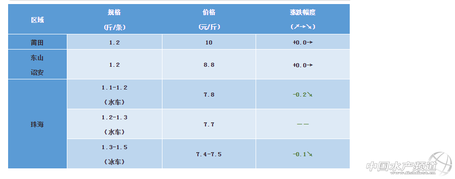 文/圖 水產前沿 植銀素 中國水產頻道原創報道,福建莆田、東山、詔安區域:鱸魚均已達到上市規格,存塘規格在1.2-1.6。福建地區鱸魚銷售主要活魚為主,莆田地區本地收魚量減少,本周價格相對穩定。 廣東珠海區域:(1)鱸魚價格依舊持續低迷,迫于魚塘到期和尾批分塘,養殖戶依舊在等安排出魚,部分有塘養殖戶選擇暫時不出;(2)下苗情況,由于成品魚價格不理想,養殖戶下苗熱情并不高,再加上今年還沒有真正意義的寒潮凍過,魚苗下塘怕有黑身死魚,養殖戶對下苗還是比較保守的;(3)寒潮準備下來,提醒廣大養殖戶提前殺蟲消毒和改底,由于本次是濕冷,很容易爆發水霉病,養殖戶群體要做好充分的準備。 ※上述報價可能會因區域、規格、品質和時間等因素的不同而會產生差異,在此僅供參考。環比幅度以本周價格與上周價格數據做對比 【關鍵字】:海鱸 海鱸價格 水產養殖 |