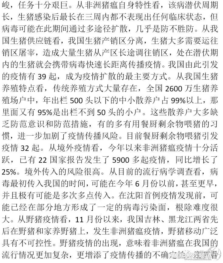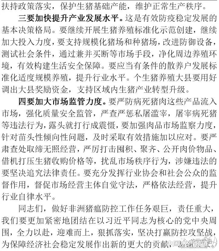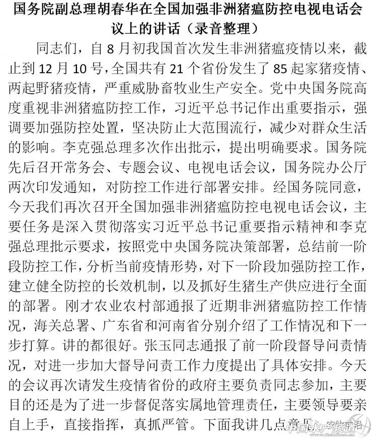 中國水產頻道原創報道, 文/農牧前沿綜合整理 12月11日,全國加強非洲豬瘟防控工作電視電話會議在北京召開。中共中央政治局委員、國務院副總理胡春華出席會議并講話。胡春華指出,當前非洲豬瘟防控形勢仍然十分嚴峻,任務十分艱巨,必須堅定防控信心,強化責任落實,全面加強防控工作。 農牧前沿也留意到,此次胡春華講話透露出幾個重大信息: 非洲豬瘟傳入我國時間可能是在今年6月份以前,甚至更早,且已經在部分地方形成一定病毒污染面,難以徹底根除。 非洲豬瘟在我國的流行情況復雜,隨著野豬疫情出現,更增添疫情傳播不確定性。 全國將全面實施分區防控,分區將不按行政省份劃分,按主產區與主銷區劃分,且各區內的產銷做到大致供需平衡。 南方及大中城市周邊地區要鼓勵建設高水平高質量的養殖企業,不能盲目禁養限養。 要鼓勵和支持大型養殖企業集團在省以內和同一個大區內布局全產業鏈,推行育、繁、養、宰、銷一體化的融合發展新格局。原則上就地屠宰變運豬為運肉,保障肉品供應穩定。 養殖布局要做一定的調整,從以前區域優勢角度考慮布局養殖到從防疫角度布局養殖。 禁止跨省調運活豬將是長期的措施。 要調整完善仔豬調運監管要求,對符合條件的仔豬開通調運能力。 以下為胡春華講話要點摘錄: 截止到12月10日,全國共21個省份發生了85起家豬疫情、兩起野豬疫情,嚴重威脅畜牧業生產安全。 從防控措施來看所采取的主要措施是有效的,落實限制生豬長途調運的各項措施后,全國因生豬及風險物品引發疫情比例由35.3%下降到了18.2%。采取禁止餐廚剩余物喂豬措施后,由此引發疫情的比例由50%下降到37.7%。 當前非洲豬瘟防控形勢依然十分嚴峻,任務十分艱巨。從非洲豬瘟自身特性看,該病潛伏周期長,生豬感染后最長在三周內都不表現出任何臨床狀態,但病毒可能在此期間通過多途徑擴散,幾乎是防不勝防。產銷區分離,生豬大多需要運往銷區屠宰,成為疫情擴撒的最主要方式。 病毒最初傳入我國的時間,可能是在今年6月份以前,甚至更早,并且極有可能是多次多點傳入。在沈陽首例疫情發現前,可能已經在部分地方形成一定的病毒污染面,根除難度很大。 野豬疫情的出現,意味著非洲豬瘟在我國的流行情況更加復雜,更增添了疫情傳播的不確定性。 我們既要充分認識前一段的防控工作的成效,更要正視下一步防控任務的艱巨性和復雜性。我們面臨的點狀發生恐怕很難在短期內消除,甚至從某種角度來講,有可能長期化。 嚴格落實現行各項關鍵防控措施。要繼續限制生豬及其產品由高風險向低風險區調運,進一步優化調運監管措施,全面強化生豬運輸車輛備案管理。 全面實施分區防控。綜合考慮區域相同動物防疫產銷互補等因素,將全國分成幾個動物防疫大區。不能簡單按照省級行政區來劃分。每個大區要明確一個牽頭的省份。 要調整優化生豬生產流通方式。科學規劃生豬養殖布局,各個省份保持一定規模養殖量,區域內要大致做到供需平衡,特別是南方及大中城市周邊地區,要鼓勵建設高水平高質量的養殖企業,確保一定的自給力,不能盲目的禁養限養,更不能一關了之、一棄了之。要鼓勵和支持大型養殖企業集團在省以內和同一個大區內布局全產業鏈,推行育、繁、養、宰、銷一體化的融合發展新格局。最大限度減少生豬長途調運,要切實加大屠宰產能布局調整,支持建設現代冷鮮肉品流通和配送體系,實現生豬出產區。原則上就地屠宰變運豬為運肉,保障肉品供應穩定。 各個省你們馬上要調查你們的豬肉來源情況,包括將來。主產區,你的豬肉主要銷往哪些區域?主銷區從哪些主產區調入豬肉,你將來不能漫天的到處去買。 我們要向國際學習,不要因為某一個省有了病,把整個行業全拖進去了,那就麻煩了。 過去我們的想法是充分發揮各地的優勢,哪個地方適合養豬,有飼料,我們就在這個地方大力發展養豬,哪個地方沒有這個優勢,我們就不養豬了。現在看來這個辦法從經濟效益上講是合適的,但從防疫上來講,是絕對有問題的。這就導致我們現在跨省、跨大區、南北東西大范圍調運生豬。所以養殖的布局要做一定的調整。 前一段時間的防控當中已經提出來了一個問題,就是禁止跨省調運活豬。我現在想告訴大家,這一個不是權宜之計,是長期的措施。大家要開始調整。 進一步加強動物的防疫科研攻關。要逐步建立完善產地檢疫和屠宰檢疫非洲豬瘟檢測出證制度,經檢測合格后方可出具檢疫證明。生豬屠宰場要配備檢疫人員和相應檢疫設備。 要堅持嚴防境外疫情傳入。 切實抓好豬肉市場供應和生豬產業的健康發展。一要強化豬肉市場供應保障。要抓緊研究出臺規模養殖場與大型屠宰企業點對點調研方案,支持符合條件的企業盡早實現點對點調運。二要切實防止生豬養殖出現大幅下滑。要積極為養殖場(戶)搞好疫情防控政策解讀和信息服務。各金融機構不僅不能抽貸斷貸,還要盡力開展扶持,加大資金支持力度,引導保險公司迅速對符合條件的養殖場戶足額理賠,幫助減輕損失,盡快恢復增長。要調整完善仔豬調運監管要求,對符合條件的仔豬開通調運能力。 以下是胡春華講話的完整記錄 非洲豬瘟對您的影響,歡迎您留言告訴我們。 轉載聲明 本文為“農牧前沿”獨家稿件 版權合作,敬請聯系wx fishfirst.cn 未獲書面許可,一