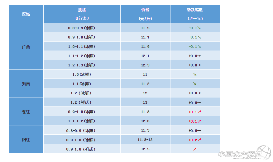 文/ 水產前沿 何鴻浩 中國水產頻道原創報道, 8年來最強寒潮襲擊全國,連華南也被凍透!今天南寧、廣州最低溫仍是個位數,似乎回暖仍是遙遠。此時各處魚肉火鍋驅寒就成為消費者最愛。看,多品種的魚價又面臨一波上漲! 金鯧魚 廣西區域:由于降溫的影響,規格魚大多提前出魚,目前規格魚存量較少,成交量較少,0.8-1.1的各規格冰鮮下跌0.1元,1.1-1.3規格魚價與上周持平,凍品價格與上周持平。凍品(新魚)200/300克的10.25元/斤(平);300/400克的11.5元/斤(平);400/500克的12.5元/斤(平);500/600克的13元/斤(-0.25);600/700克的13.75元/斤(平)。 ※上述報價可能會因區域、規格、品質和時間等因素的不同而會產生差異,在此僅供參考。環比幅度以本周價格與上周價格數據做對比 |