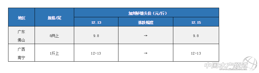 中國水產(chǎn)頻道原創(chuàng)報道, 12月15日各產(chǎn)區(qū)加州鱸行情與塘頭報價 文/圖 水產(chǎn)前沿 李曉欣 本周末多地天氣以升溫為主題,據(jù)中國天氣網(wǎng)消息,北方氣溫率先回升,到明天(16日)累積升溫幅度普遍將達到4-8℃,局地可達10℃左右;南方升溫會持續(xù)到下周二前后,累積升溫幅度普遍會達到6-12℃。這次回暖之猛,將10℃線從華南一路向北推到了華北南部一帶。 中央氣象臺預(yù)計,17日前后長江中下游一帶以及江南、西南多地最高氣溫將回升至15℃上下,華南升至20℃出頭,明起三天(16-18日)南方將迎來大范圍的晴好天氣。今天各產(chǎn)區(qū)加州鱸塘頭價基本持穩(wěn),隨著天氣逐漸回暖、道路暢通,外省魚車到廣東拉魚將有所增多,預(yù)計廣東加州鱸銷量將慢慢上升。 產(chǎn)區(qū)加州鱸塘頭價及行情簡析 華南地區(qū) 廣東佛山:佛山養(yǎng)戶現(xiàn)在以出大規(guī)格魚為主,今天8兩上加州鱸報價9.8元/斤左右,具體成交價看魚頭大小和規(guī)格比例略有浮動。隨著天氣回暖、道路暢通,外省魚車到佛山收魚量將有所增加,預(yù)計廣東加州鱸銷量將慢慢上升。 廣西南寧:南寧本地魚達上市規(guī)格的比較少,養(yǎng)戶基本很少出魚,1斤上加州鱸塘頭價維持在12-13元/斤,市場以廣東魚為主。 華東地區(qū) 浙江湖州:今天湖州8兩上加州鱸報價10元/斤左右,統(tǒng)貨報價8.5-9.5元/斤左右,具體看8兩上成次。現(xiàn)在湖州存魚大多達上市規(guī)格,養(yǎng)戶大多在積極出魚,市場供應(yīng)充足,魚價上漲乏力。 江蘇吳江:今天吳江加州鱸7兩上報價9.5元/斤,8兩上10元/斤。目前的魚價吳江養(yǎng)戶出魚意愿不強,當(dāng)?shù)鼗竞苌俪鲷~,流通商多到湖州區(qū)域收魚,預(yù)計魚價短期內(nèi)波動不大。 華中地區(qū) 湖北武漢:武漢9兩上加州鱸今天報價10.5-11元/斤左右,現(xiàn)在武漢養(yǎng)戶很少出魚,市場以廣東魚為主。受廣東魚沖擊市場影響,預(yù)計短期內(nèi)魚價上漲機會不大。 湖南華容:今天華容9兩上加州鱸報價10.8-11元/斤左右,受廣東和武漢等地魚價低迷影響,流通商到華容收魚減少,近期華容走量都不大,養(yǎng)戶多在觀望等價,預(yù)計元旦前后銷量或?qū)⒆咔巍?/div> 西南地區(qū) 四川成都:成都9兩上加州鱸今天報價12.5元/斤,現(xiàn)在價格賣魚利潤不高,當(dāng)?shù)仞B(yǎng)戶待價惜售居多,本地出魚量不大,流通商到廣東拉魚有所增多。 |