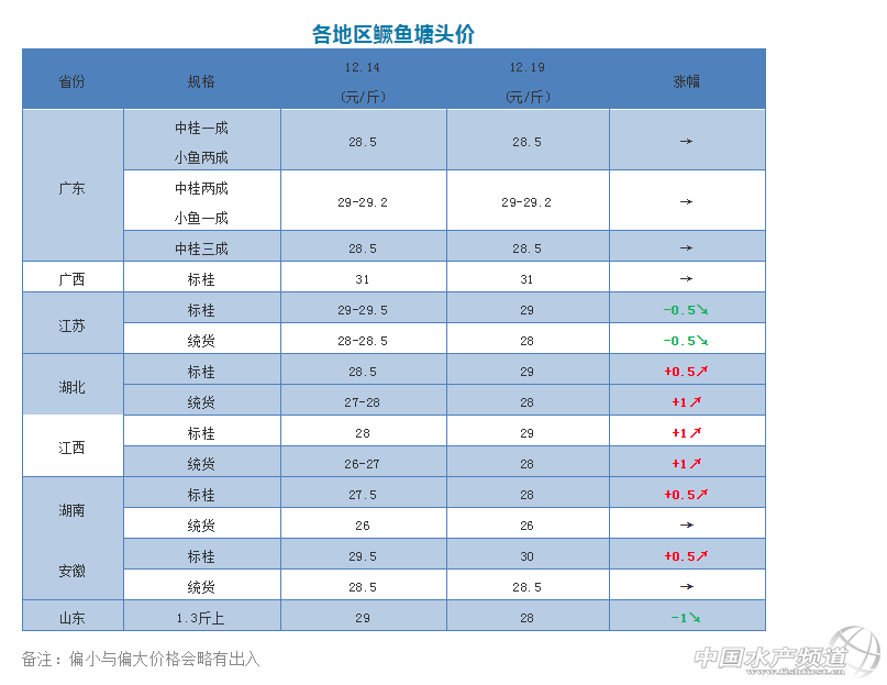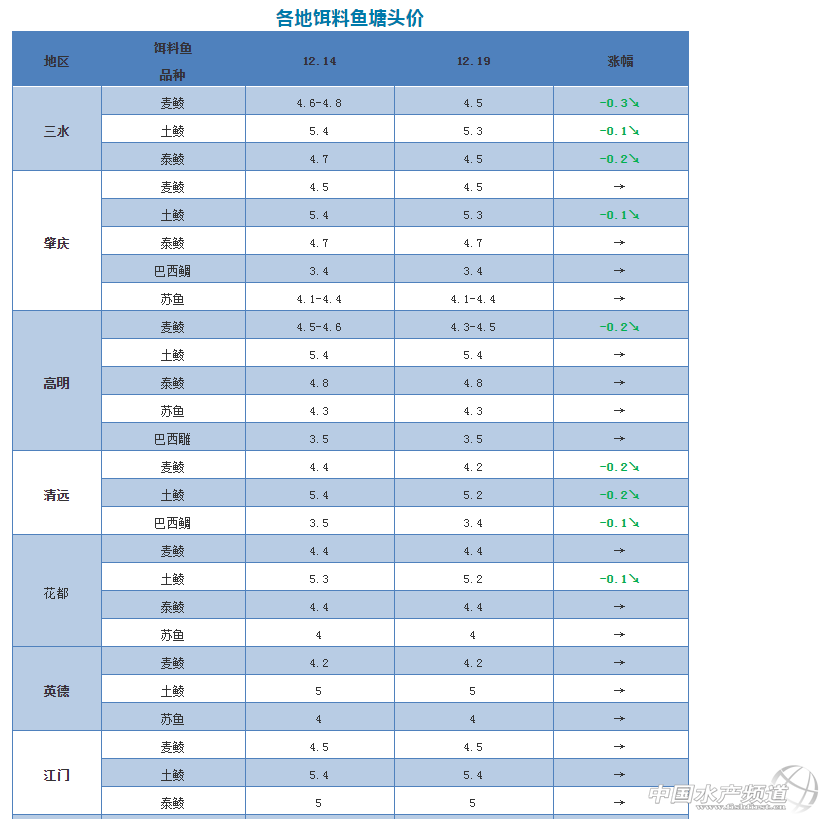中國水產頻道原創報道, 文/圖 水產前沿 李靜 最近,廣東鱖魚價格繼續持穩,規格最好的塘頭訂29元/斤左右。最近廣東市場鱖魚行情較差,偏大規格更差,偏大魚占比較高的訂28元/斤。據流通商反映,每年這個時候鱖魚銷量都比較低迷,本周江蘇和山東也分別跌了0.5-1元/斤。 不過,隨著外省本地魚存量下降,本周不少省份鱖魚價格出現明顯上漲。其中湖北標桂上漲了0.5元/斤,今天訂29元/斤;統貨上漲了1元/斤,訂28元/斤左右。江西標桂和統貨分別上漲了1元/斤,今天標桂訂29元/斤。湖南標桂上漲了0.5元/斤,今天標桂訂28元/斤。安徽標桂漲了0.5元/斤,標桂訂30元/斤。預計最近行情持穩,12月26號以后鱖魚行情有望好轉,塘頭價格有望穩中有升。 本周,不少地區餌料魚價格跌幅明顯。三水麥鯪、土鯪、泰鯪分別跌了0.1-0.3元/斤左右;肇慶土鯪跌了0.1元/斤左右;高明麥鯪跌了0.2元/斤左右;清遠麥鯪、土鯪、巴西鯛分別跌了0.1-0.2元/斤左右;花都土鯪跌了0.1元/斤左右;其他地區的價格暫時保持穩定。近日,氣溫降低,部分地區土鯪有凍死的情況出現,鱖魚攝食量減少,餌料魚銷量大減,預計近期價格有可能繼續下滑。 |
