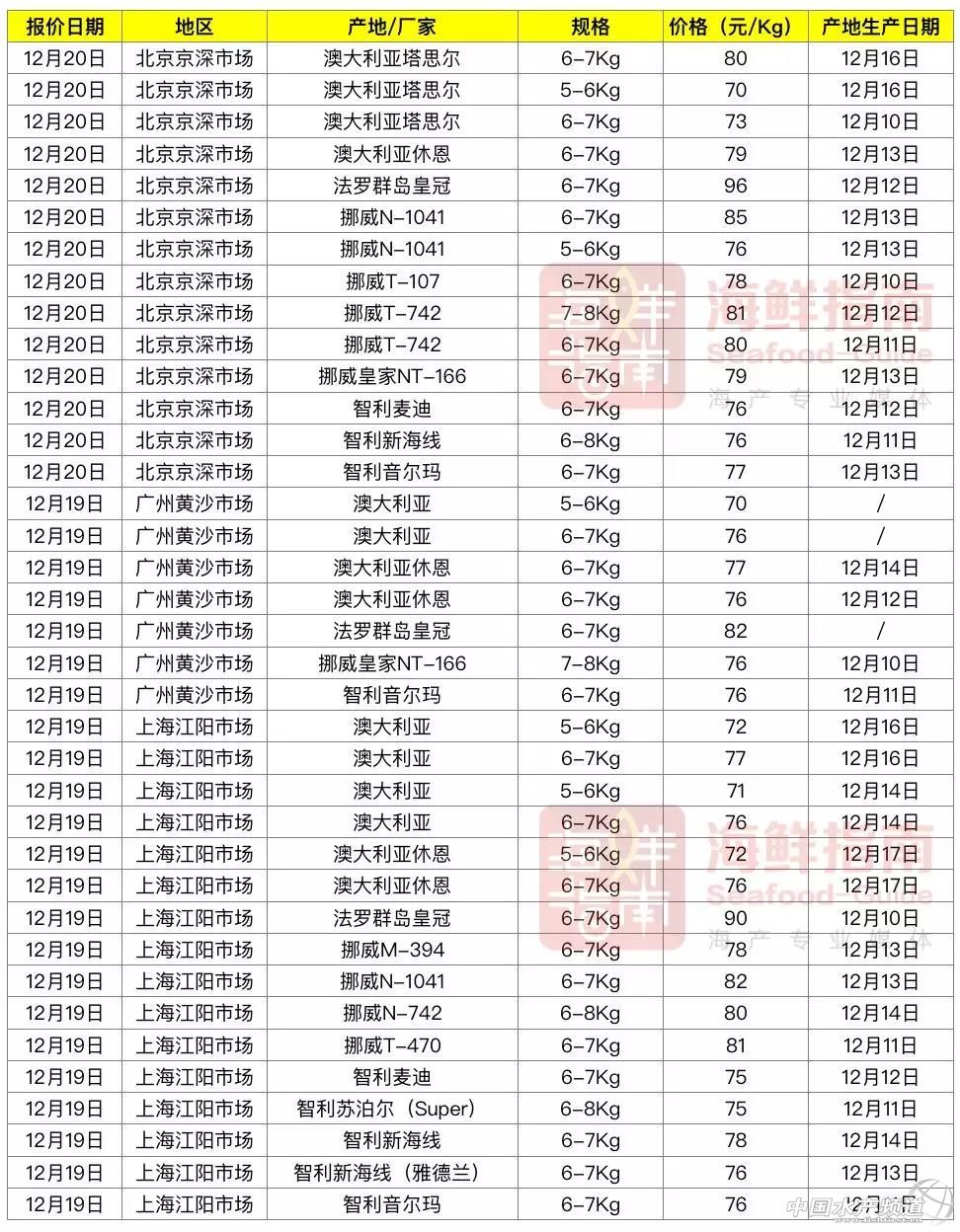 中國水產頻道原創報道, 海鮮指南將于每周推出三次全國最大批發市場冰鮮三文魚報價,敬請持續關注! 文/ 海鮮指南(seafood-guide)沈基文 12月19日至20日,北京智利、上海挪威、上海智利、廣州挪威、廣州智利等冰鮮三文魚出現不同幅度下降,北京、上海法羅群島三文魚持平,廣州小幅上升。 部分業者告訴海鮮指南,法羅群島產區近來天氣不佳,生產產量有限,加上未來一段時間工廠假期休產,預計法羅群島三文魚到貨量較少,行情或有好轉。 盡管近兩周挪威三文魚市場貨量充足,但由于圣誕、元旦假期休產原因,業者預測本周末至元旦假期期間到貨量不會太多。 詳細報價請參考下圖(12月19日至20日全國批發市場冰鮮三文魚報價): 聲明: 1、本文所提三文魚均指大西洋鮭; 2、報價均為進口商批發價,與零售/餐飲/酒店渠道報價不相等,請勿對號入座; 3、報價僅供參考,報價詳情咨詢請聯系本文作者(海鮮指南 編輯部 沈基文)18620796931 今天(12月20日)早間,北京:澳大利亞(16日生產)小魚報價70元/公斤、大魚80元/公斤,與12月17日報價上漲1元/公斤;智利(13日生產)大魚77元/公斤,比12月17日下降2元/公斤;挪威(13日生產)大魚報價85元/公斤,與12月17日持平;法羅群島(13日生產)大魚報價96元/公斤,業者表示與昨天市場報價持平; 昨天(12月19日)晚間,上海:澳大利亞(16日生產)小魚72元/公斤、大魚77元/公斤,小魚價格與12月17日持平,大魚價格降了1元/公斤;法羅群島(10日生產)大魚90元/公斤;挪威(13日生產)大魚78元/公斤,比12月17日下降了7元/公斤;智利(12日)大魚75元/公斤,與12月17日下降了3元/公斤; 昨天(12月19日),廣州:澳大利亞小魚70元/公斤、大魚76元/公斤,與12月17日報價上漲2元/公斤;法羅大魚82元/公斤,與12月17日報價上漲1元/公斤;挪威(10日生產)大魚報價76元/公斤,比12月17日下降6元/公斤;智利(11日生產)大魚76元/公斤,比12月17日下降2元/公斤。 |