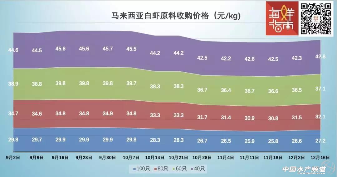 12月16日,100只/kg和80只/kg原料蝦2周以來基本保持平穩、60只/kg漲幅為0.5元/kg、40只/kg漲幅為0.5元/kg。