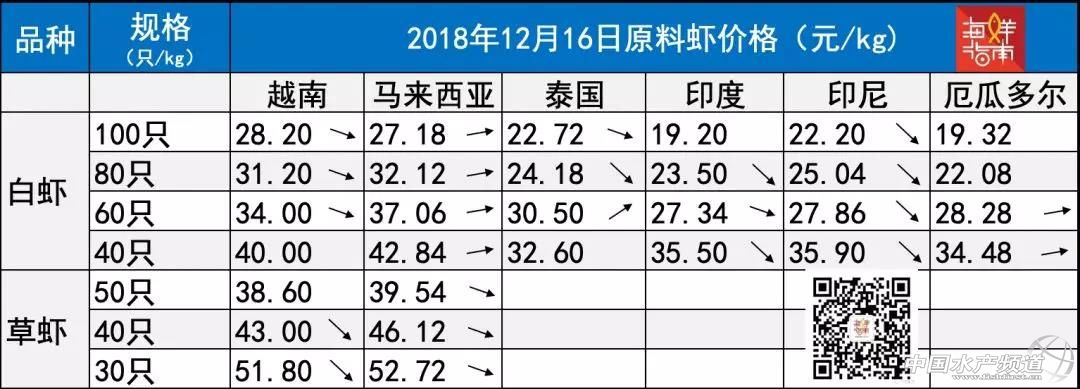12月16日,印度100只/kg原料蝦2周降幅為0.2元/kg,80只/kg的降幅為1.8元/kg、60只/kg降幅為0.5元/公斤、40只/kg降幅高達2.8元/kg。